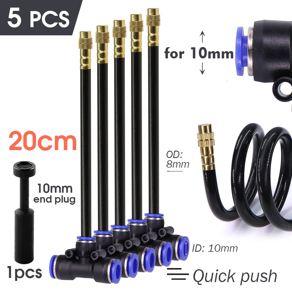 Our atomizing nozzles come with secure tee joints suitable for OD 6mm, 8mm, 10mm, and 12mm pipes, including PU,PE, thickened PVC, and Nylon hoses. Each tee joint is equipped with a plug to stop water flow when needed. All hose connectors are meticulously designed to prevent detachment, guaranteeing a secure fit and preventing leaks under various conditions.