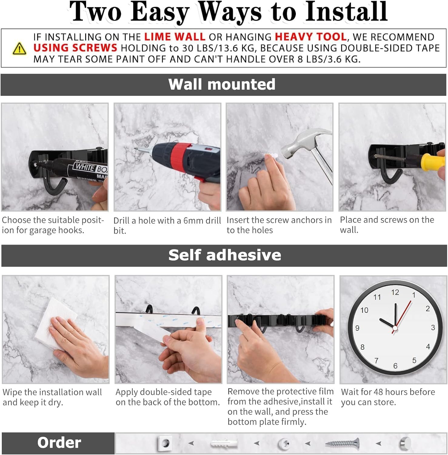 The broom holder is designed for easy installation on a variety of surfaces. Choose between self-adhesive mounting for smooth surfaces or screw drilling wall mount for rougher textures. For heavier items or outdoor use, screw drilling is recommended to ensure a secure and long-lasting hold.