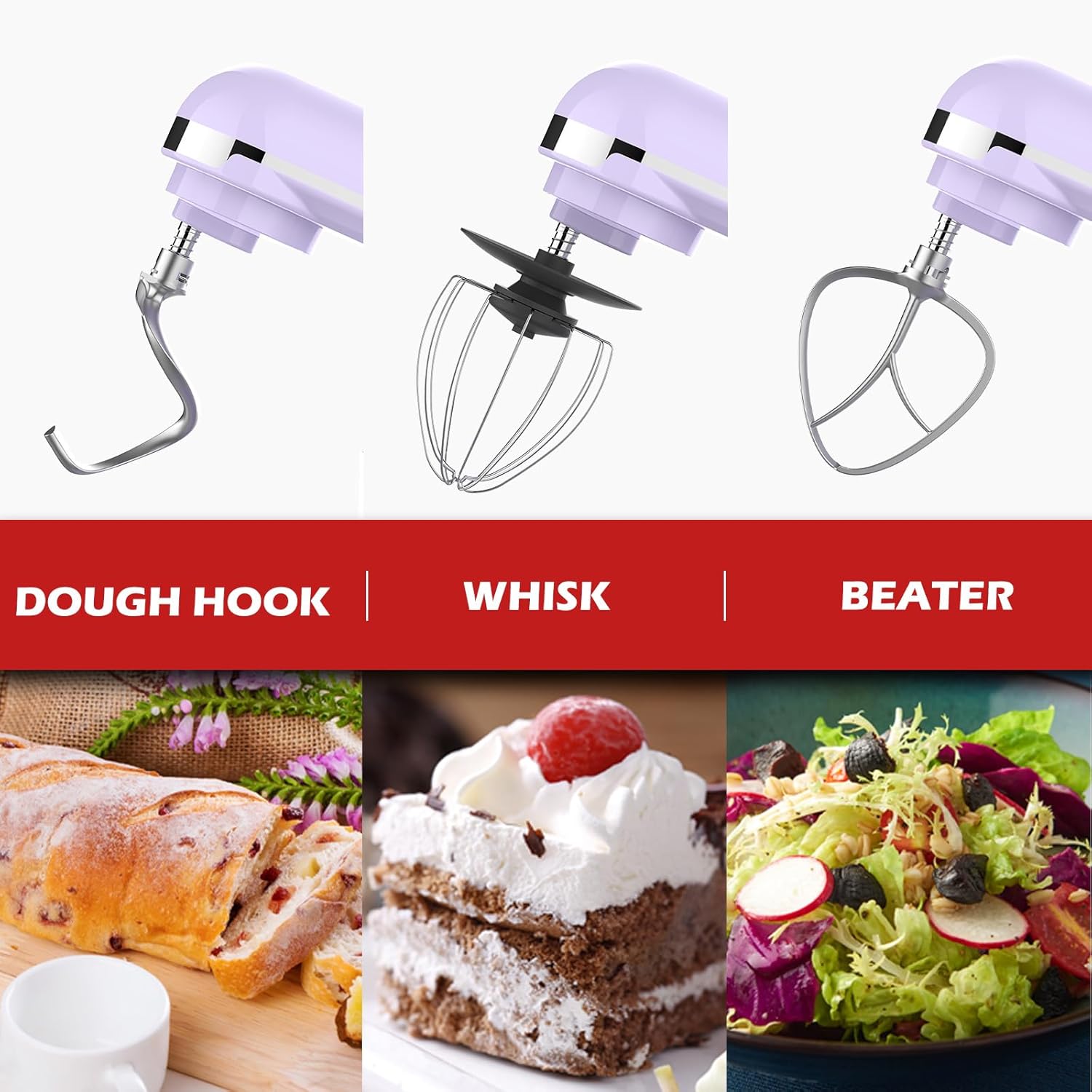 Why invest in multiple single-purpose gadgets when one machine can do it all? This multi-functional food mixer offers a 3-in-1 capability: effortlessly knead dough with the S-shaped hook, beat cream or egg whites to perfection with the 12-line egg beater, and mix and stir ingredients uniformly with the flat beater. Whether you're baking a cake, making bread, or preparing sauces, this mixer has the right attachment for the job, ensuring thorough and consistent results every time.