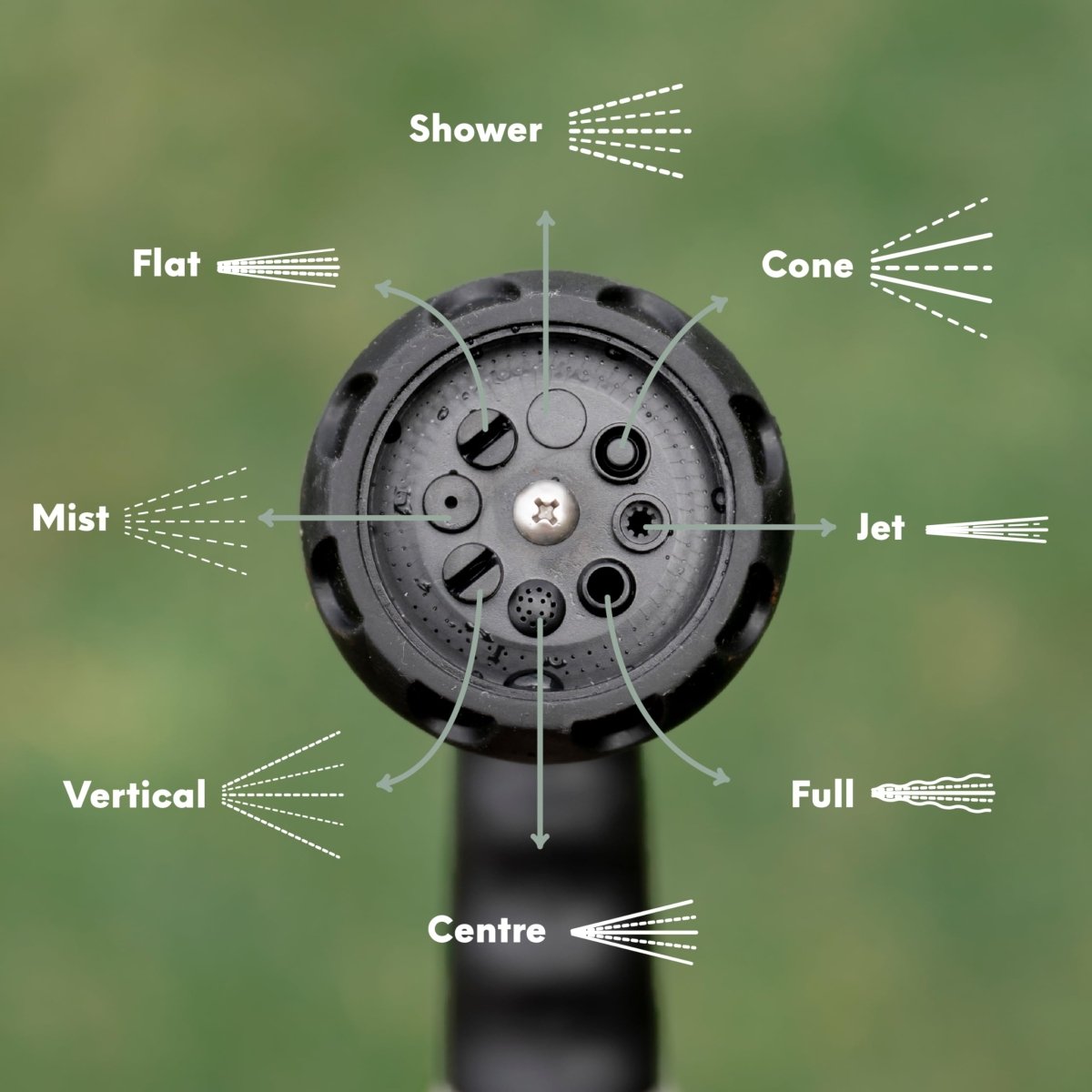 This sprayer features 9 distinct water patterns to suit all your needs: