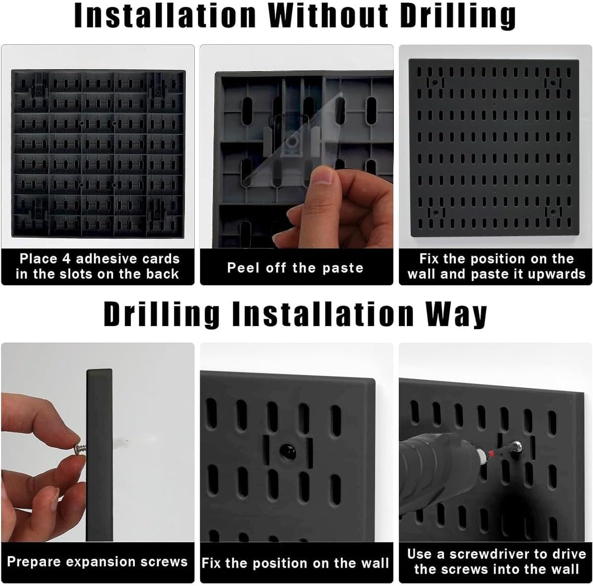 - 【TWO INSTALLATION OPTIONS】Our Pegboard Wall Organizer offers you two versatile installation methods, optimizing your space into a clutter-free haven. The first method is the traditional perforation installation (using a 6mm drill bit), allowing you to securely mount the pegboard on the wall. Additionally, the second method is a non-perforating self-adhesive installation (be sure to eliminate air bubbles), perfect for those who prefer not to drill holes in the wall.