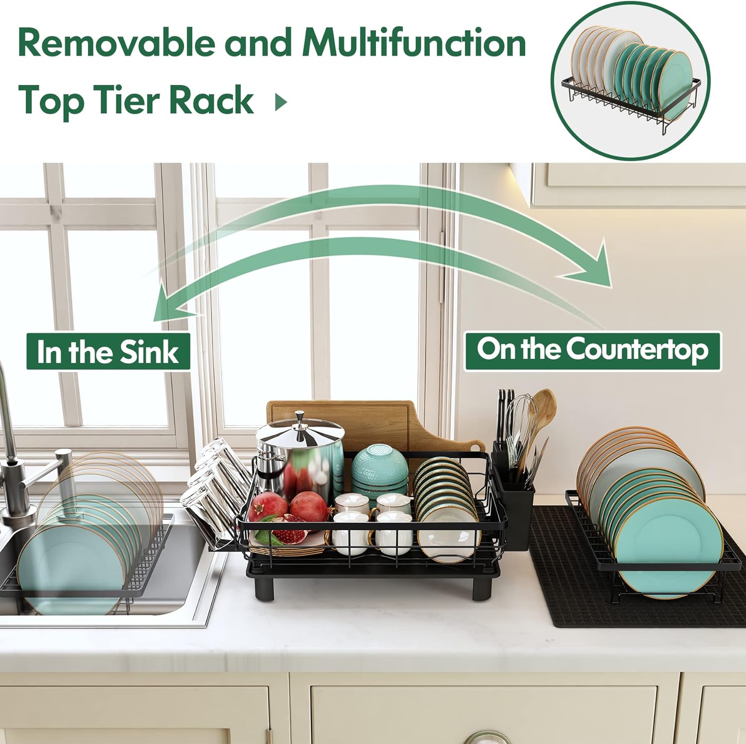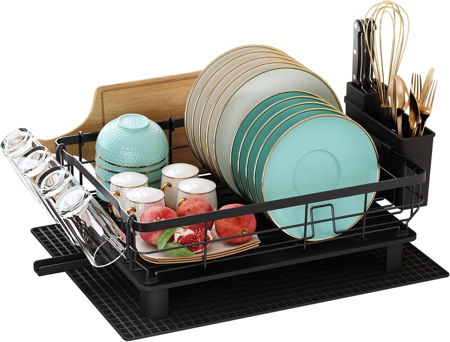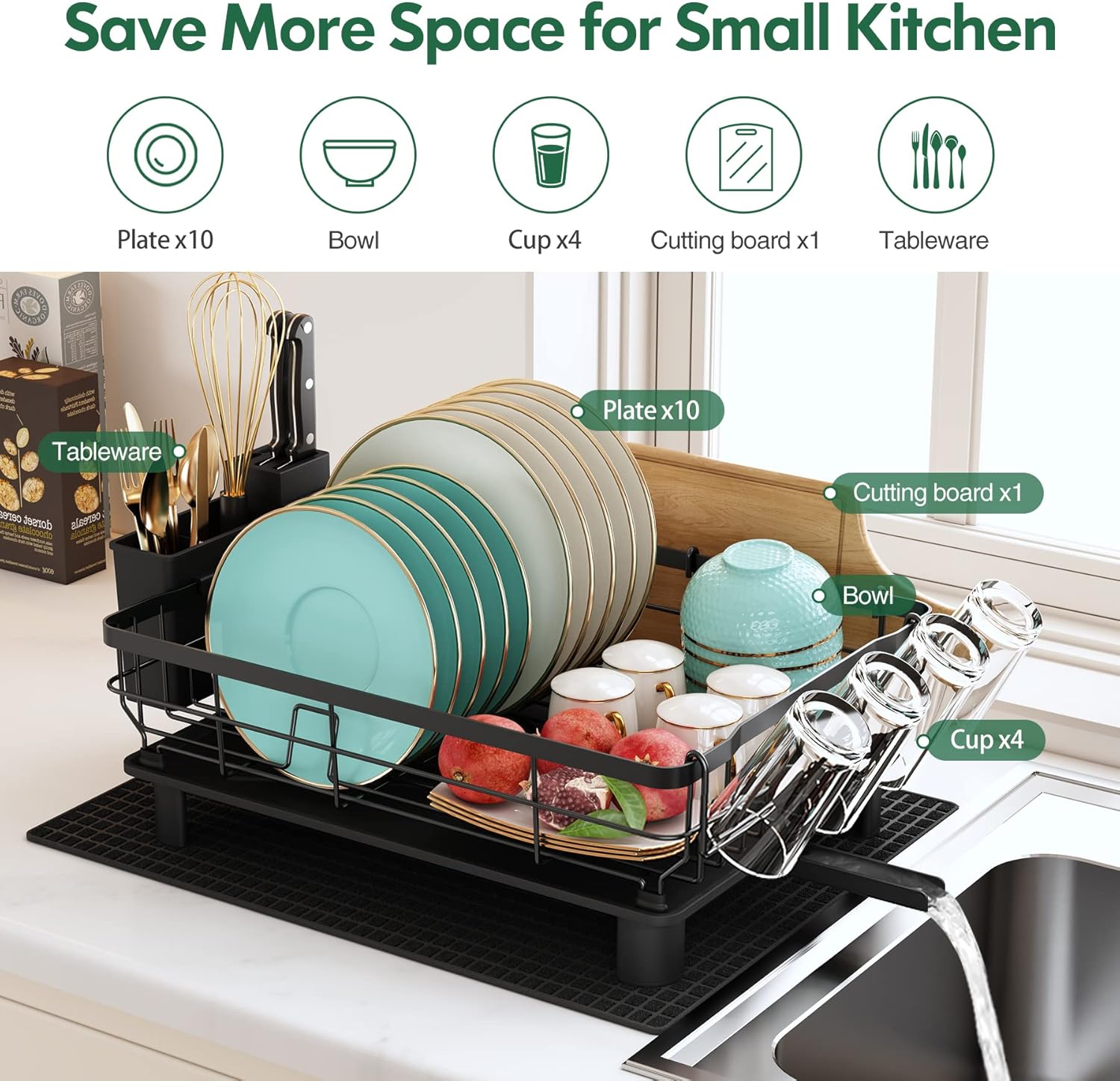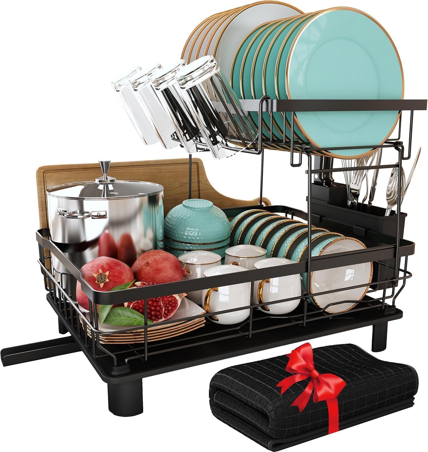 Our drying rack for dishes is two-tier and gives space to be able to store more. Come with a cup holder, cutting board/cookie sheet holder, knife and utensil holder, and dish drying mat. All Attachments can be moved, you can rearrange the cup holders and utensil holders to your liking.