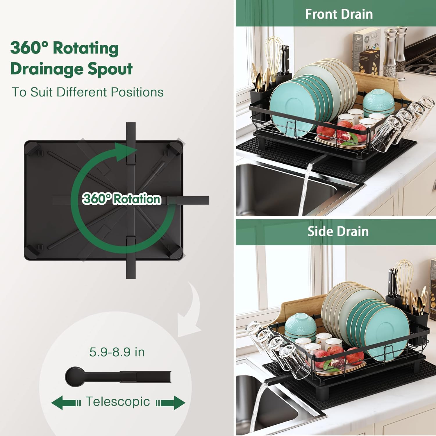- Innovative Drainboard & No leaking: This Dish Drainer Rack comes with an automatic drainboard that has more ridges and a more angled board to drain water and keep the counter dry. It also has a 360° Rotatable Spout so you can move it to adapt to your sink and have it work. The additional dry mat makes the job, even more, easier for the instant drying of dishes