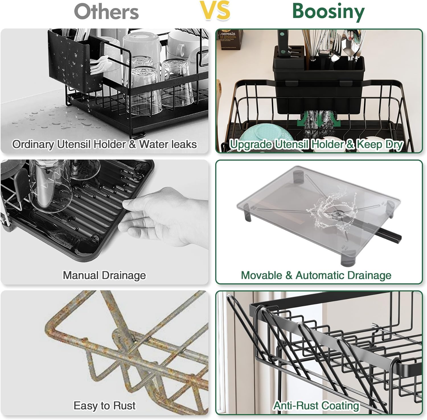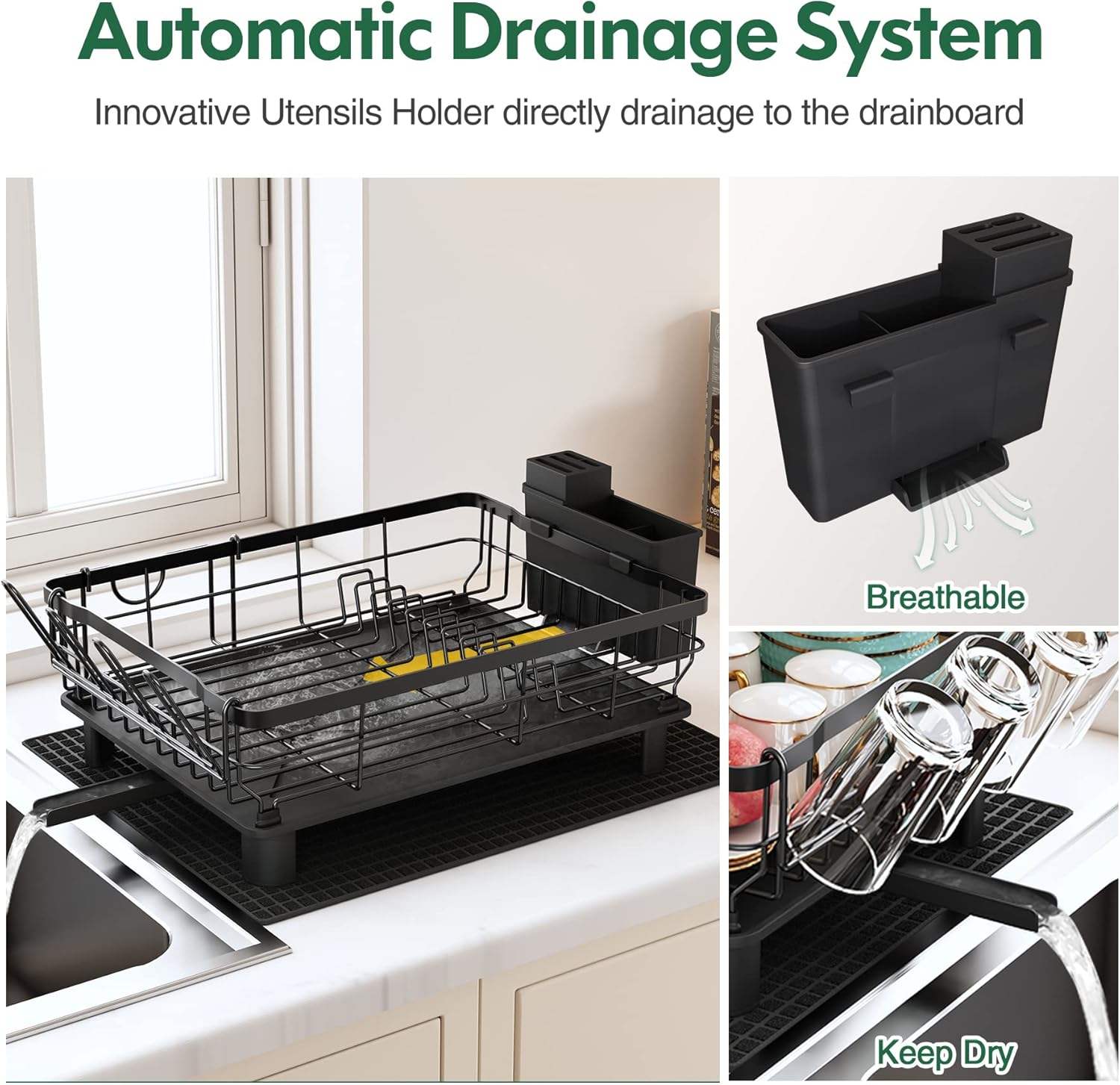 - Upgrade Utensil Holder Make It Works Better: The kitchen utensil rack has a separate area with various-sized slots to hold your different-sized knives. The knife compartment is enclosed which can protect you or your children from cuts. Besides, this kitchen dish drying rack has a useful outfall that guides the water flow into the drainboard and not leaking on the counter anymore