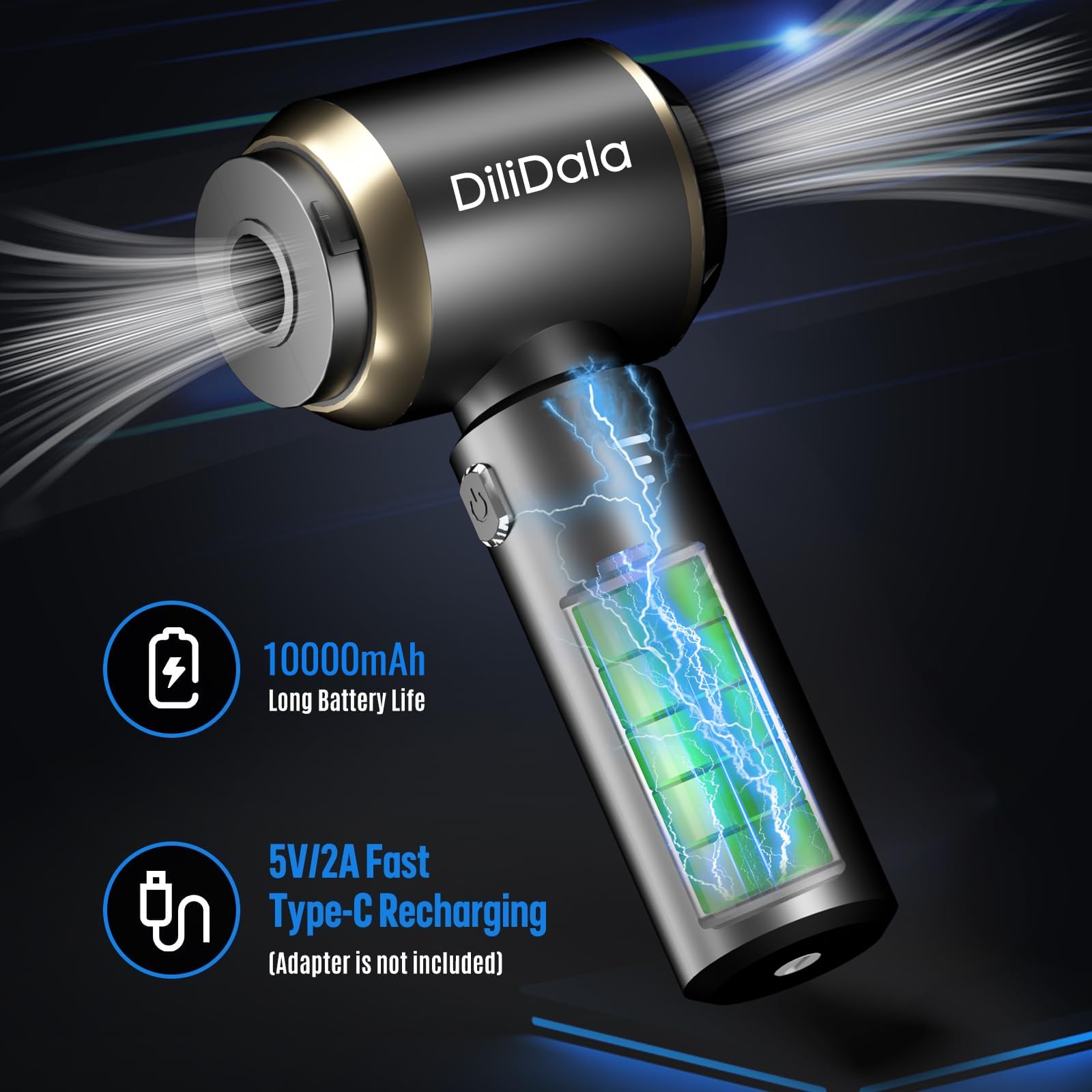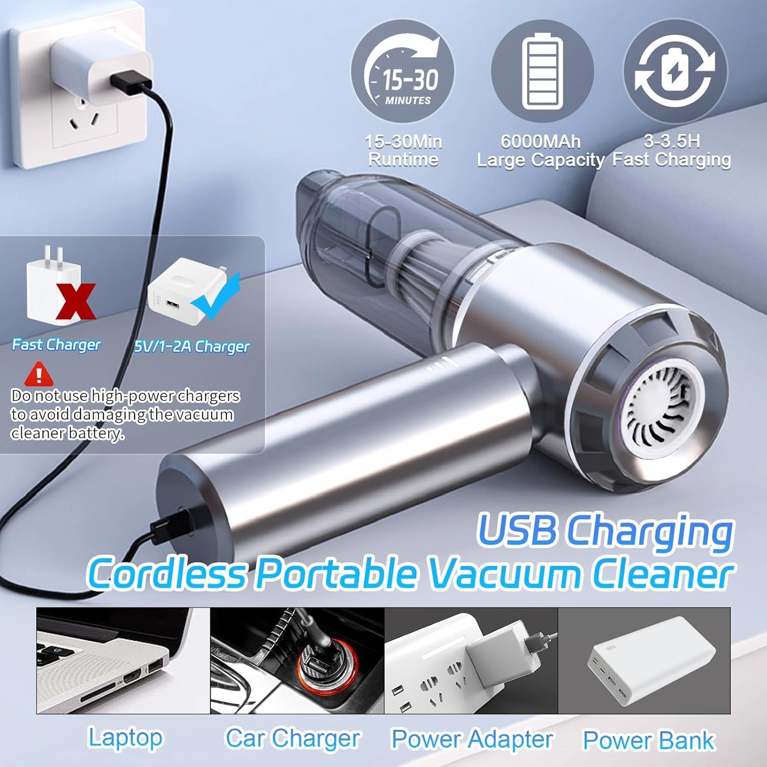 The DiliDala mini vacuum is powered by a built-in 10000mAh battery that provides up to 20-40 minutes of continuous operation on a single charge. After charging for about 3 hours, it’s ready to go again. Please note, it’s recommended to use a 5V/2A charger for best performance (adapter not included).