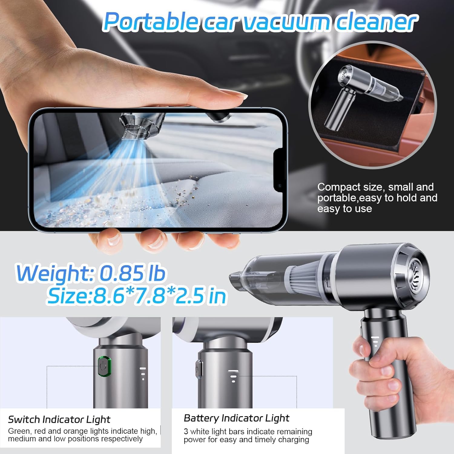 Car Vacuum Cleaner Cordless, Handheld Vacuum 22000PA High Power Suction, 4-in-1 Compressed Air Duster & Air Blower & Pump, Portable Vacuum Cleaner with 3 Gears for Home, Pet, Keyboard (Grey)