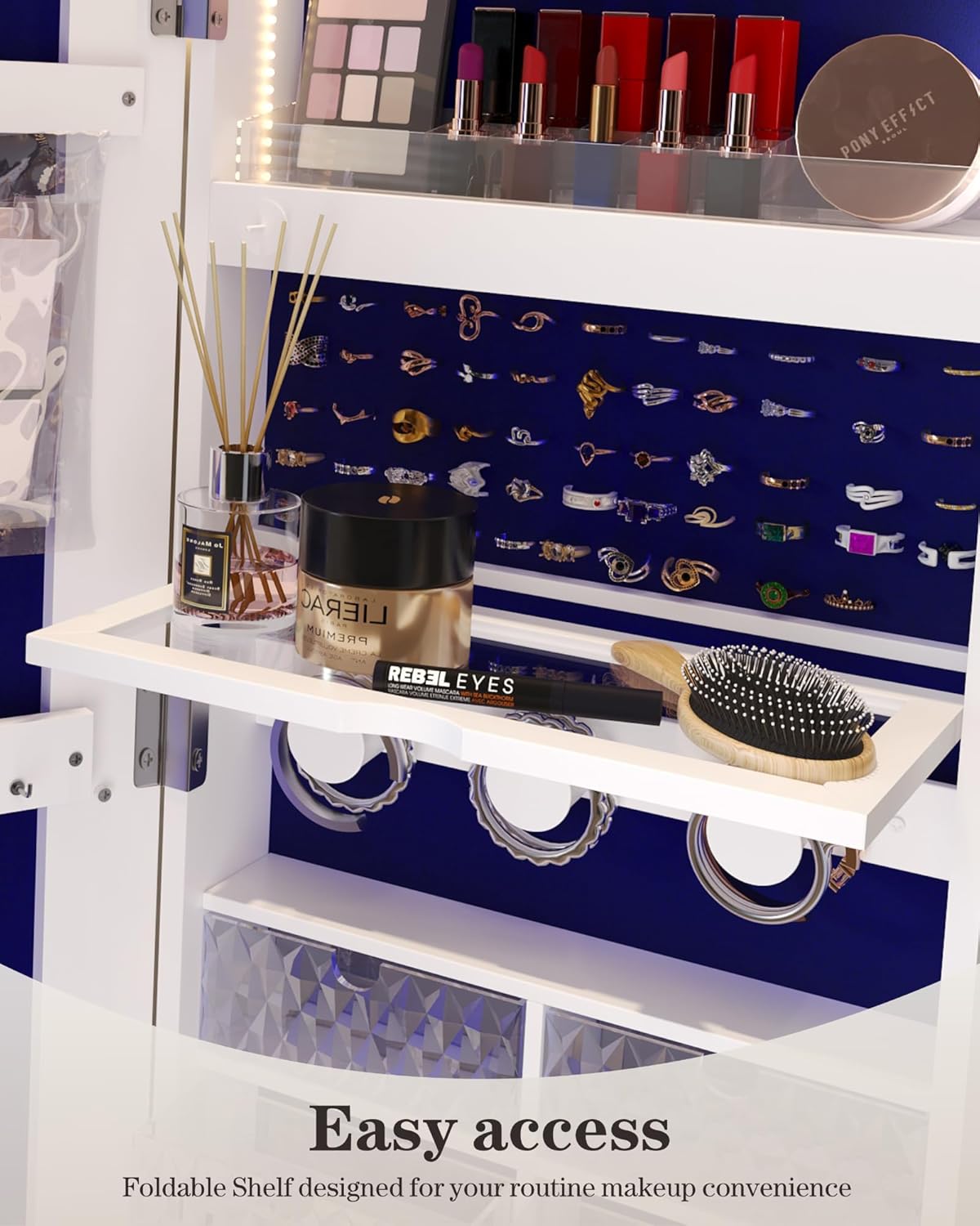 The foldable shelf for jewelry organizer allows you to conveniently place your cosmetics and makeup tools while doing your makeup.