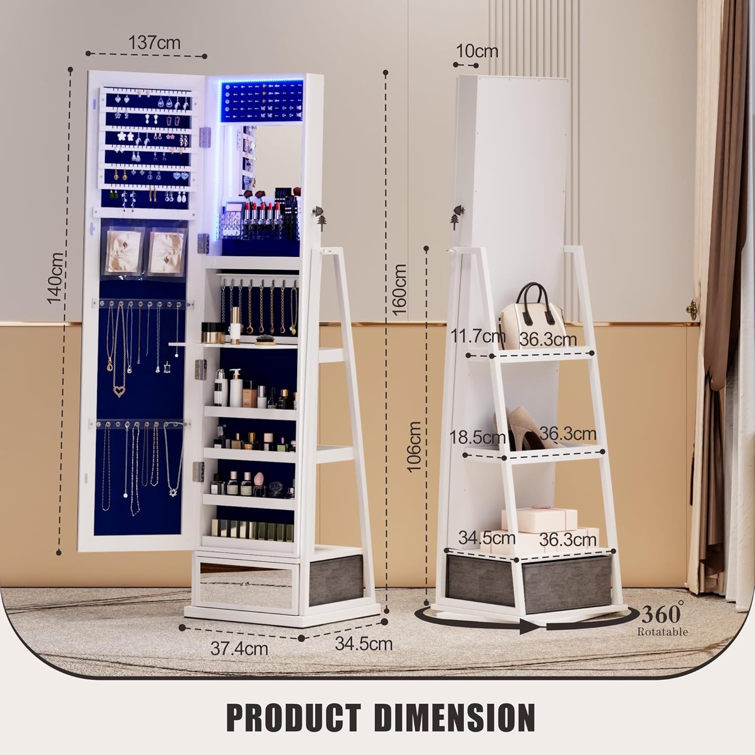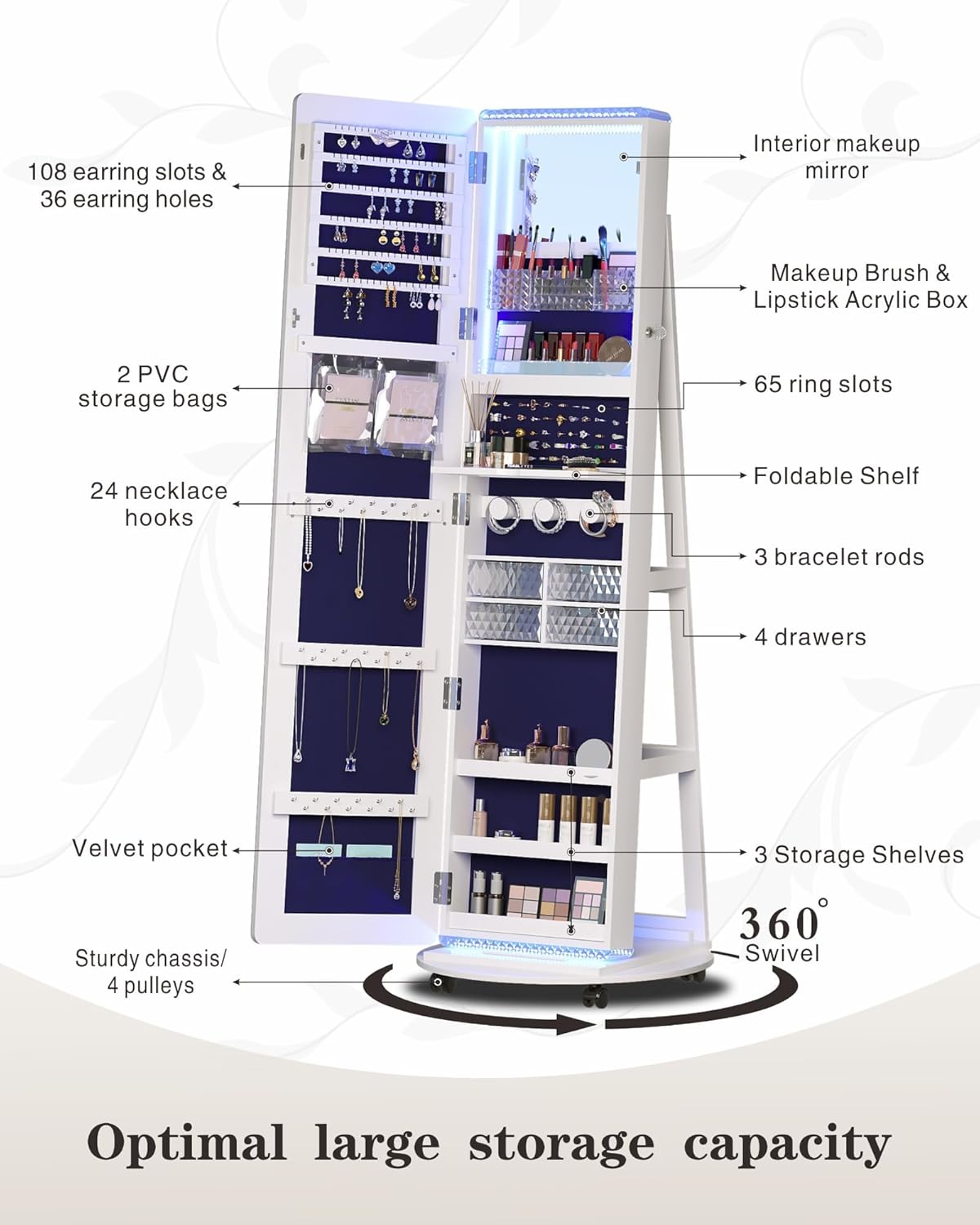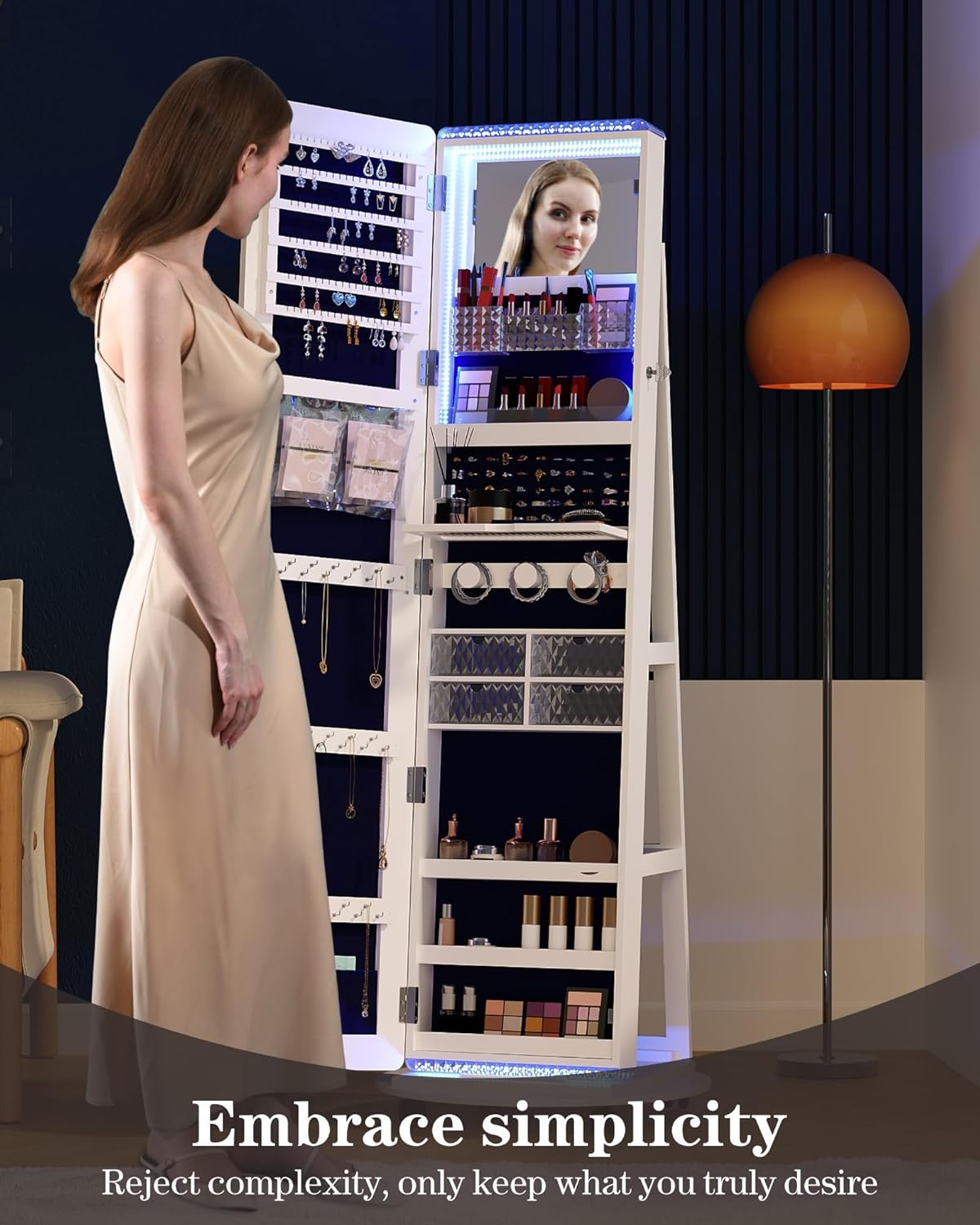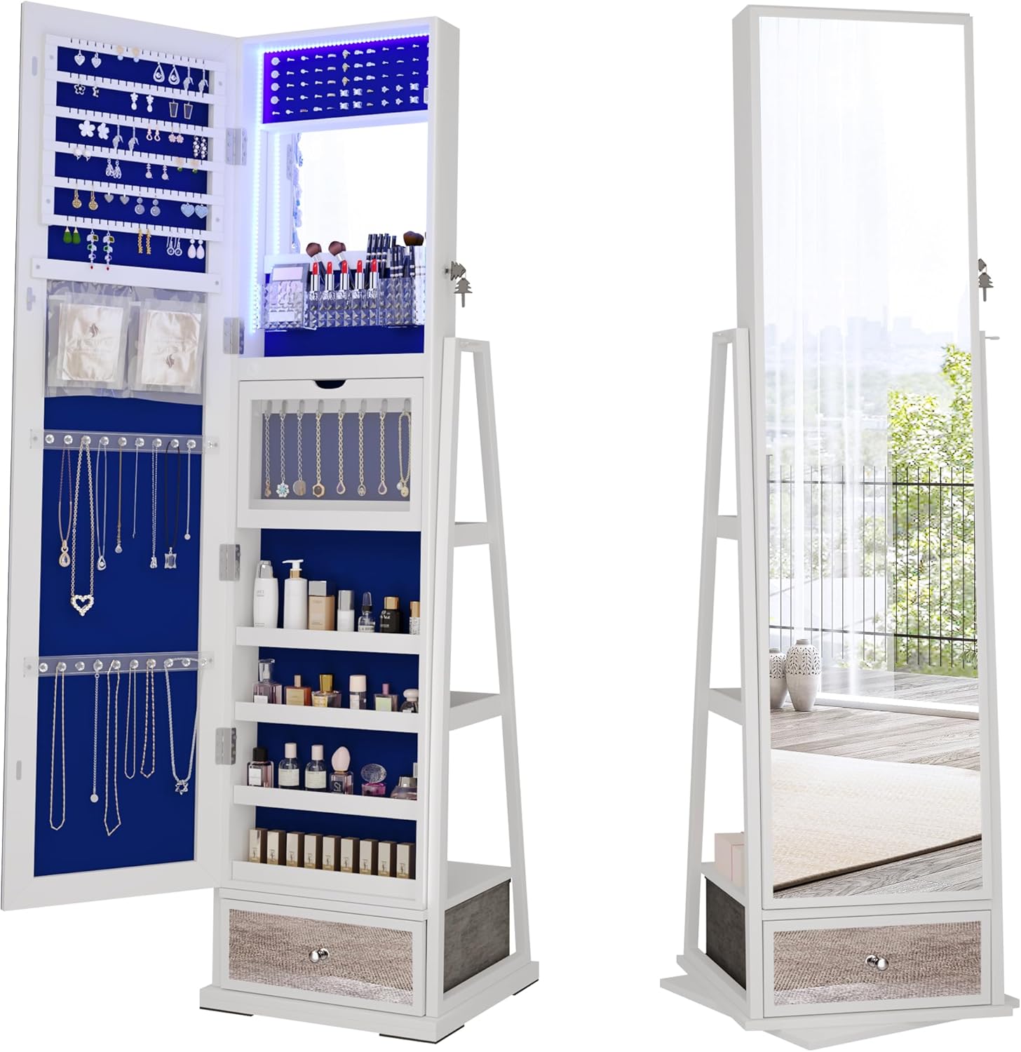 This standing jewelry cabinet with mirror is more than just a reflection—it’s a multifunctional storage unit that keeps your jewelry, makeup, and accessories organized while adding an elegant touch to your space. Featuring a 360° rotating base, this jewelry armoire with lights makes it easy to access everything from earrings to cosmetics.