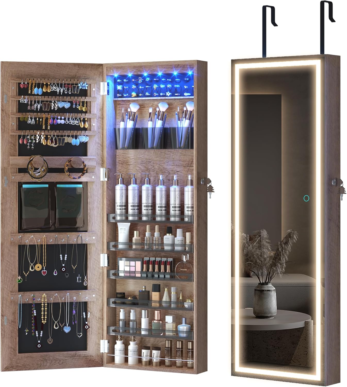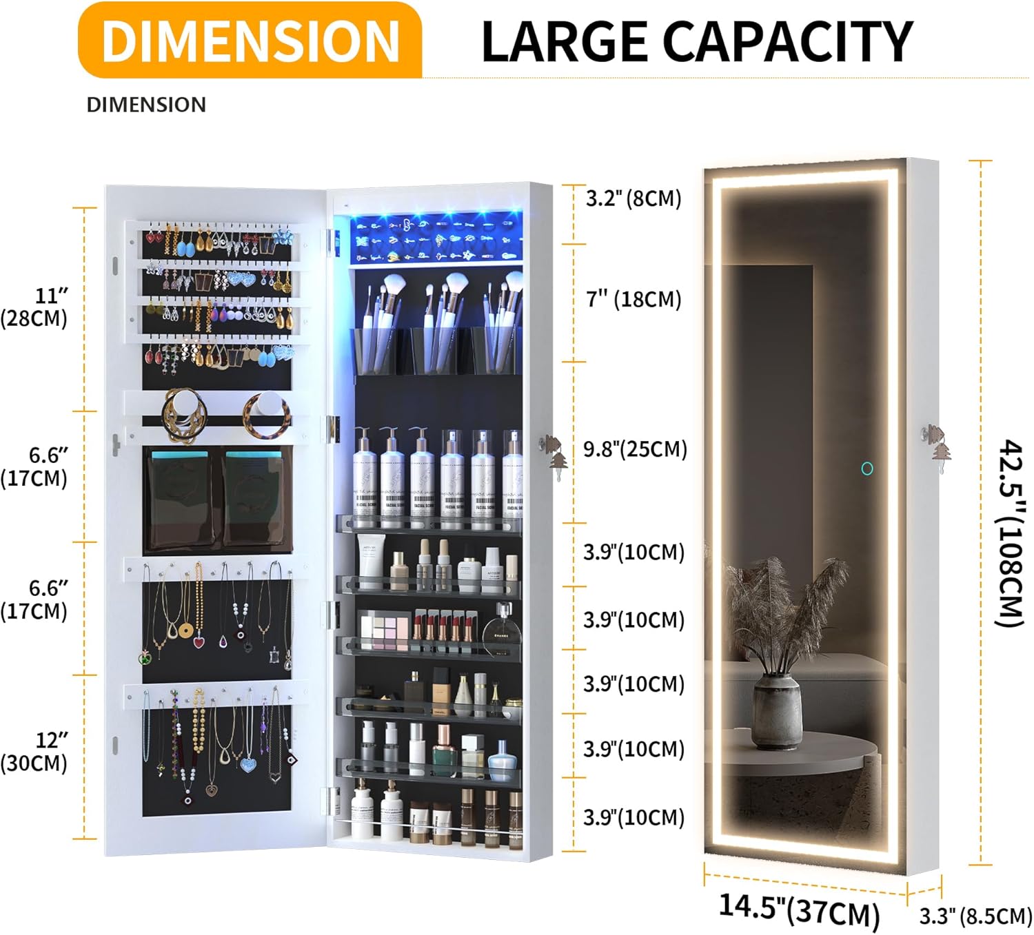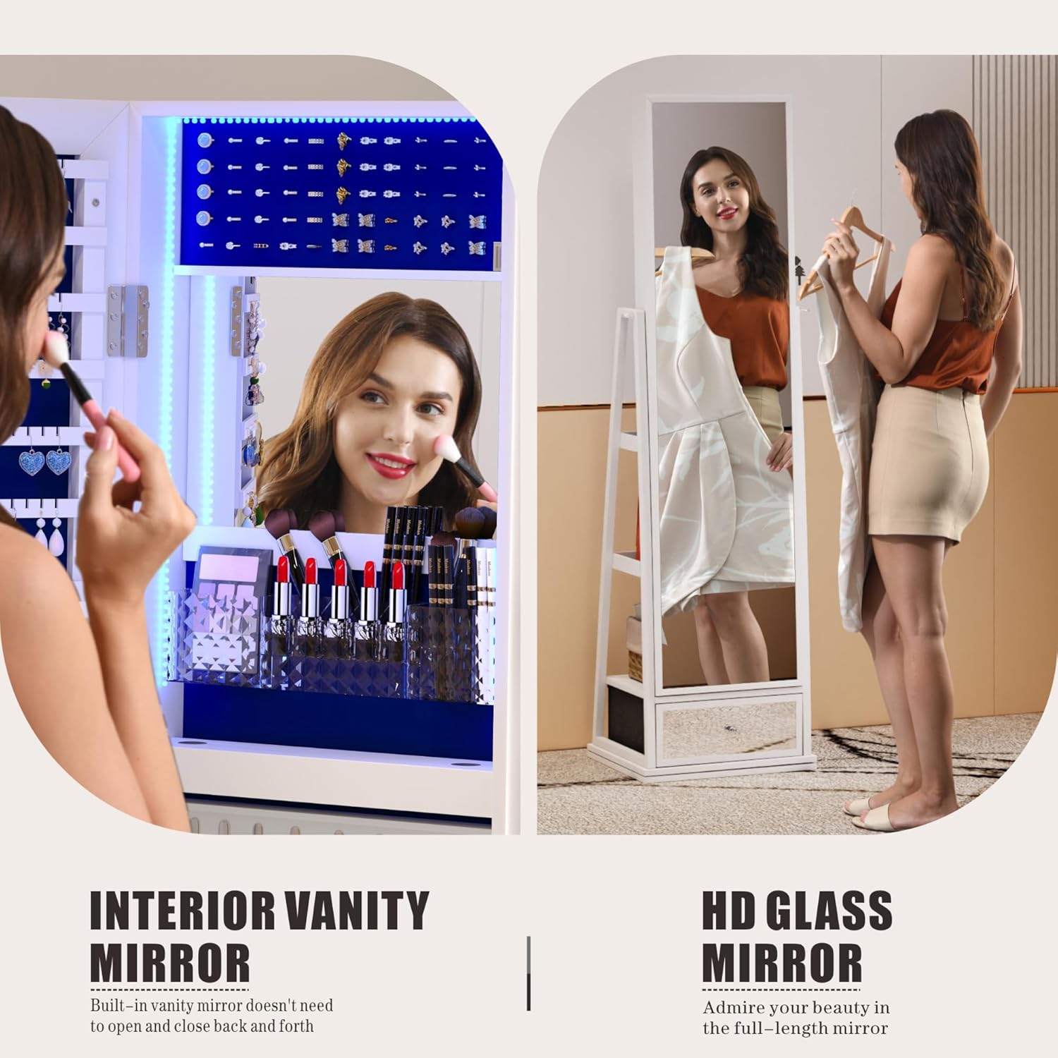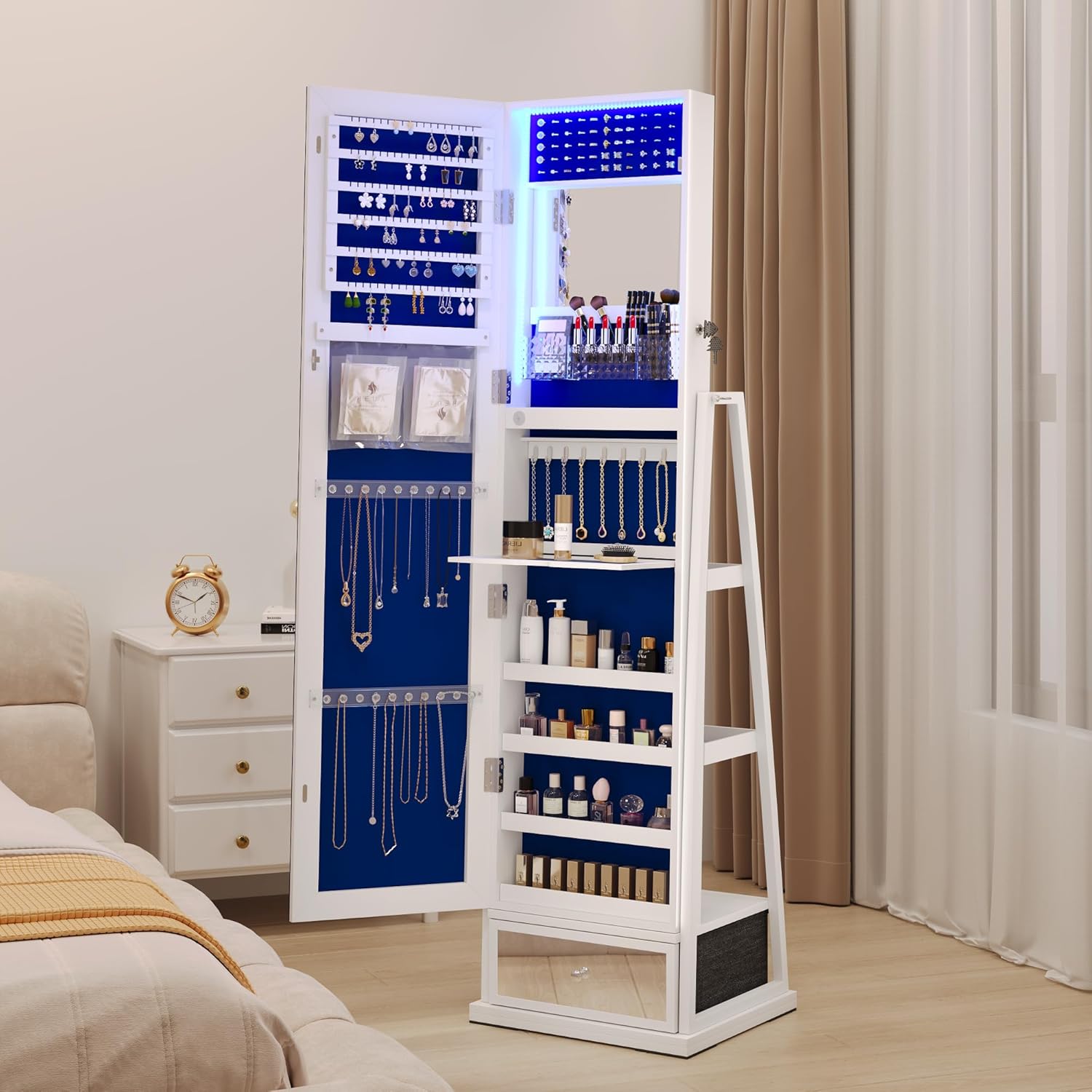 It has not just a full-length mirror with storage, but also a integrated makeup mirror with jewelry storage.