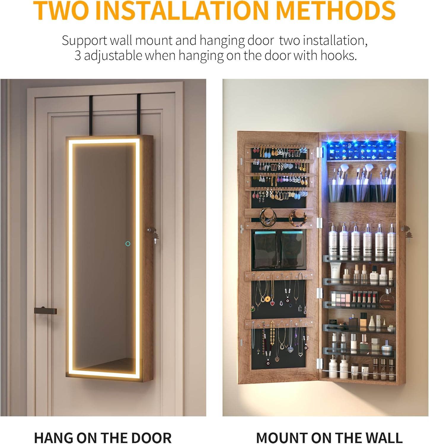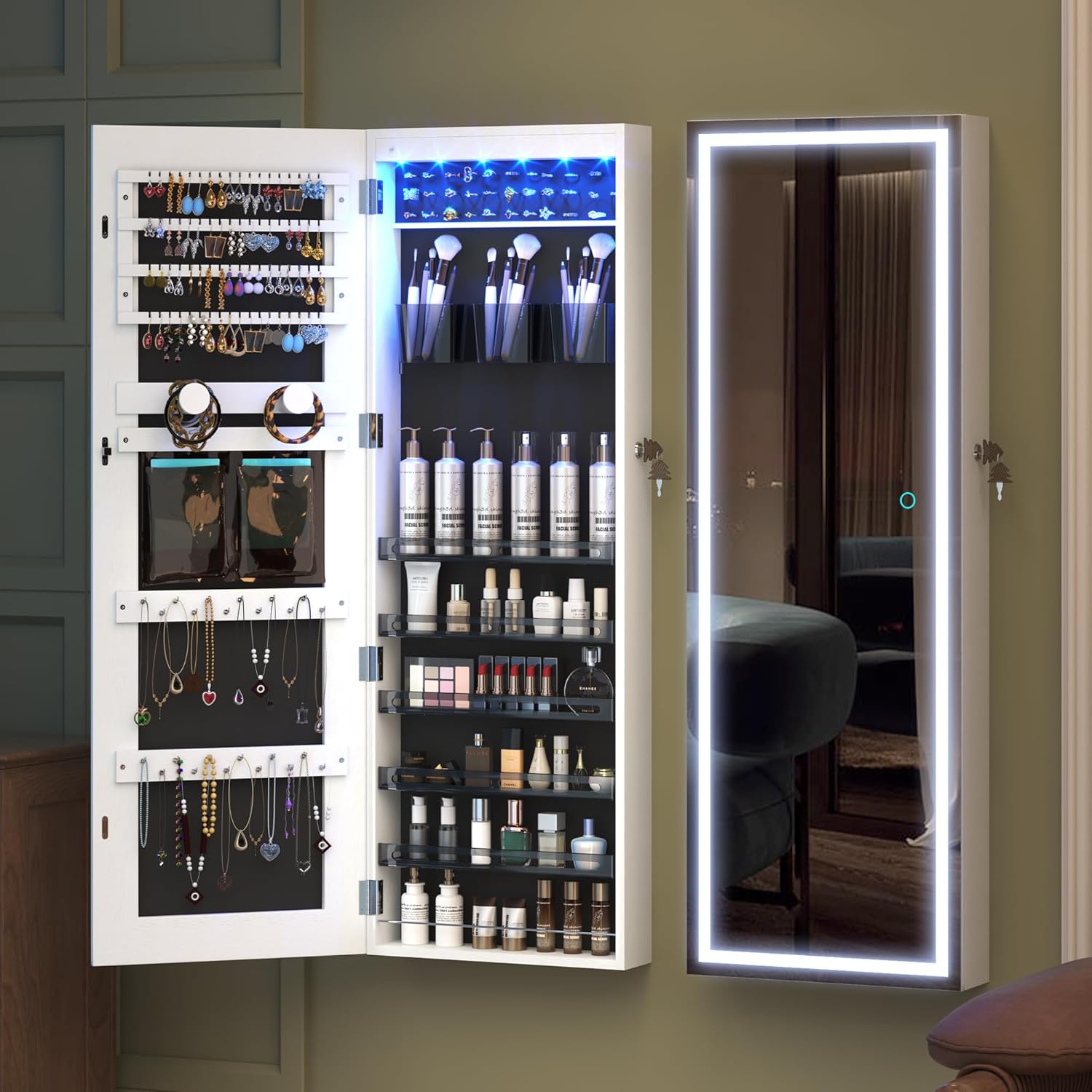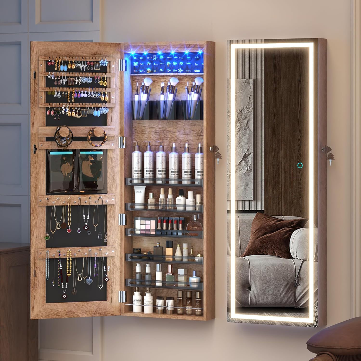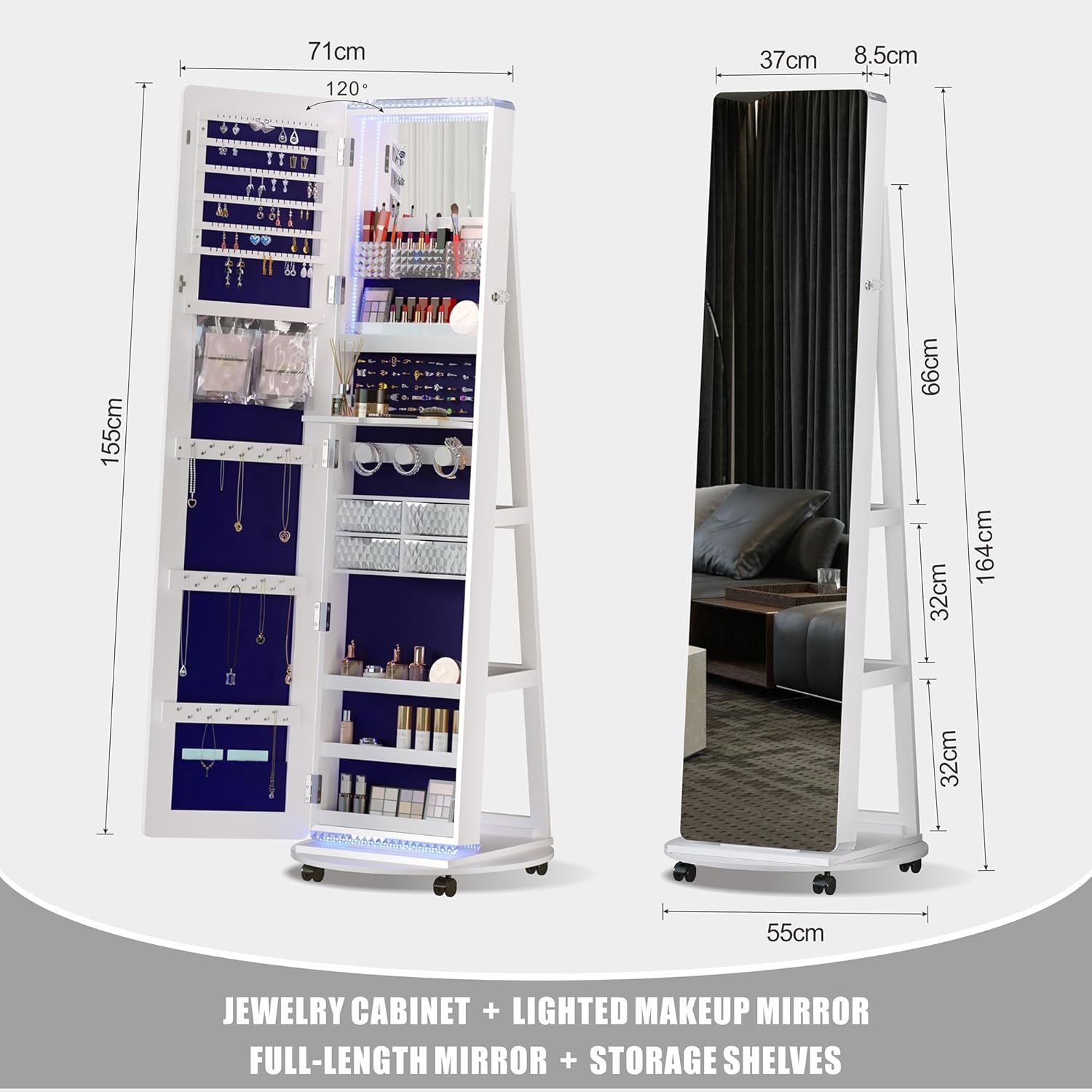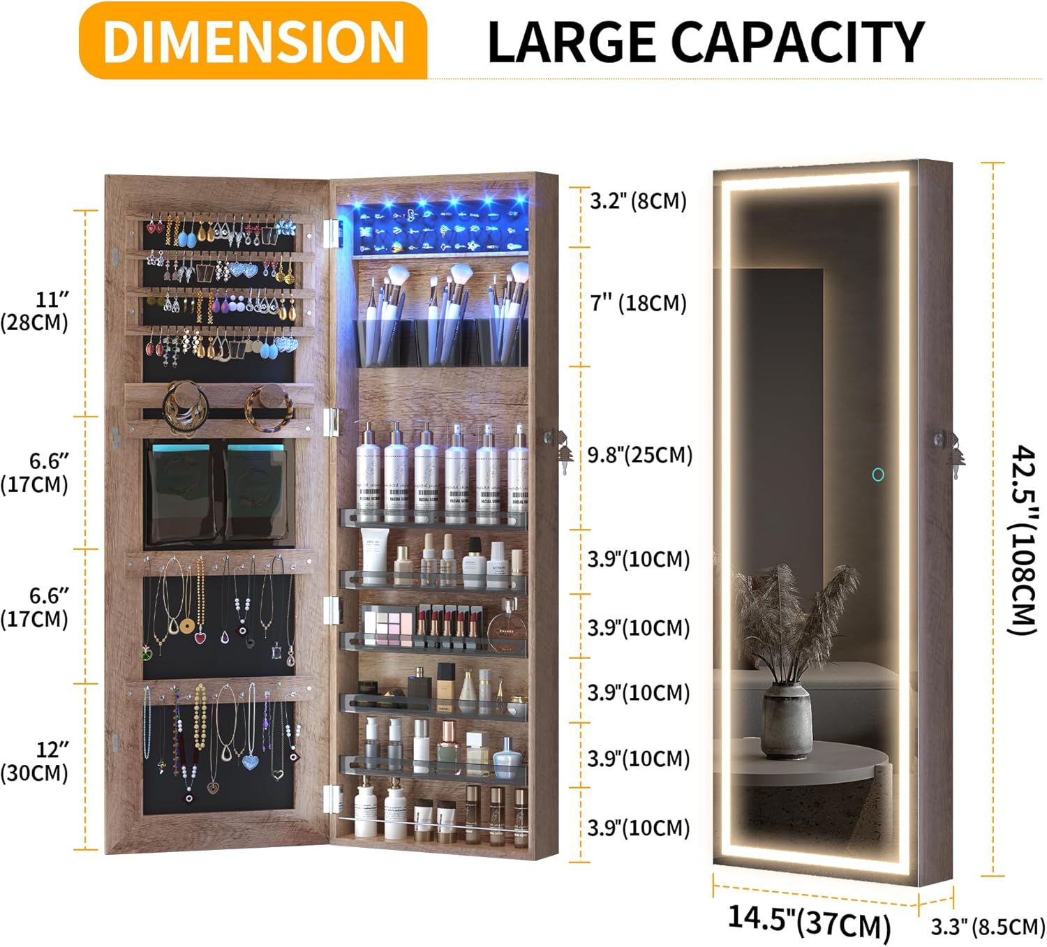 It has not just a full-length mirror with storage, but also a integrated makeup mirror with jewelry storage.
