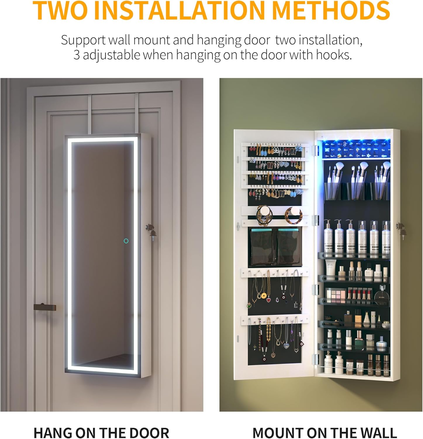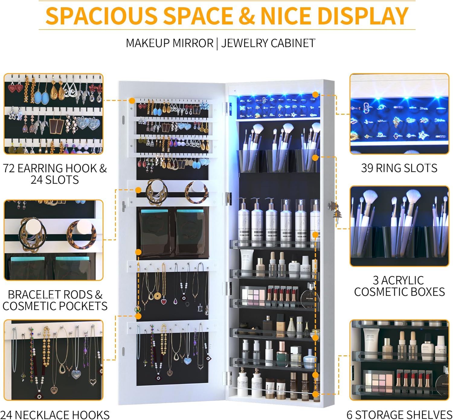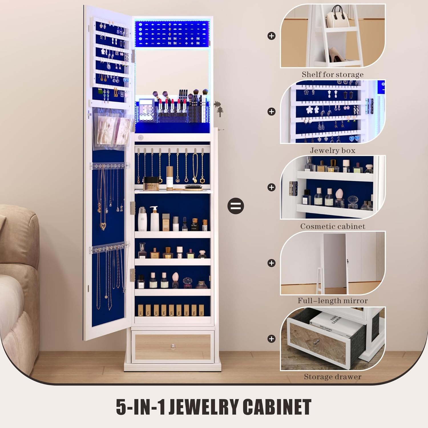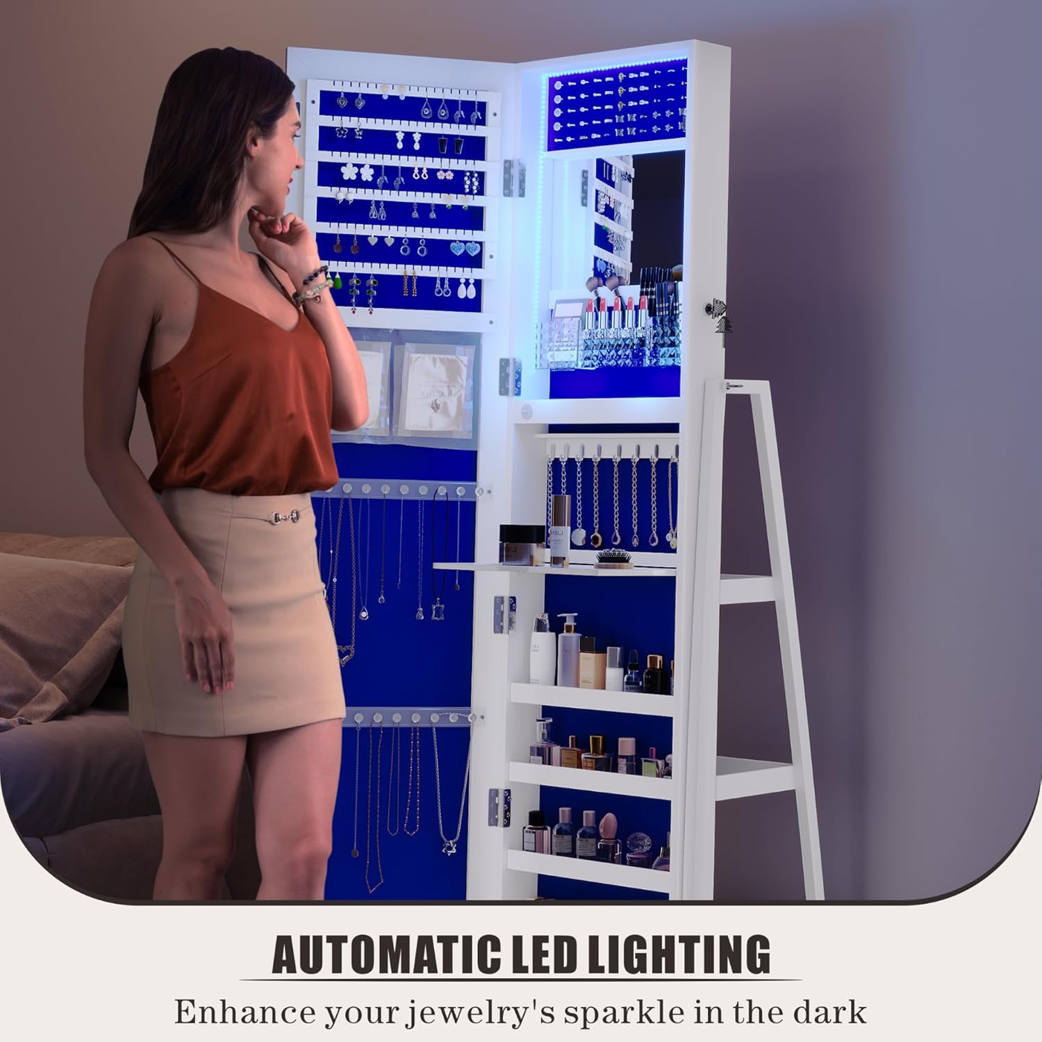 • Crafted from high-quality MDF wood, this freestanding jewelry cabinet ensures durability and stability.