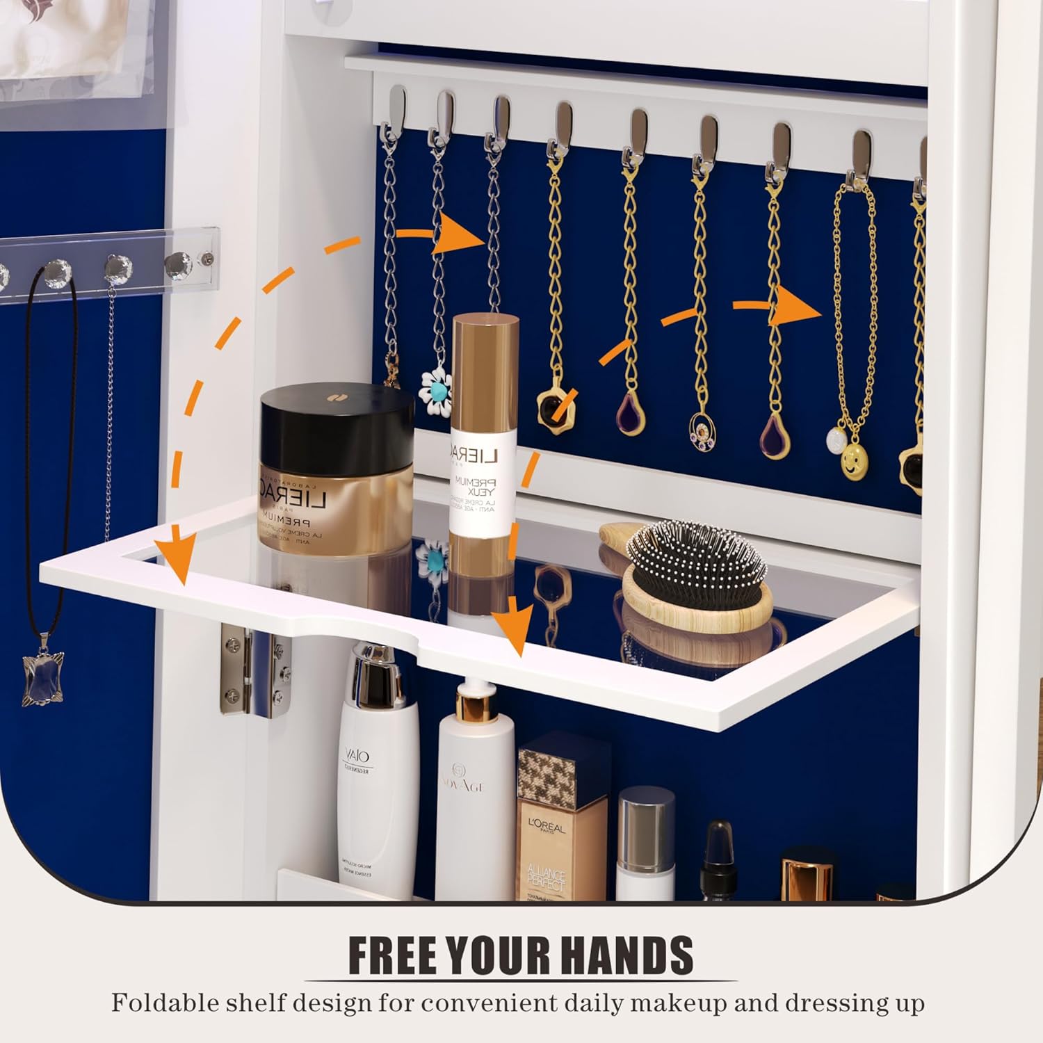 • A foldable makeup shelf provides space for cosmetics, brushes, and beauty tools.