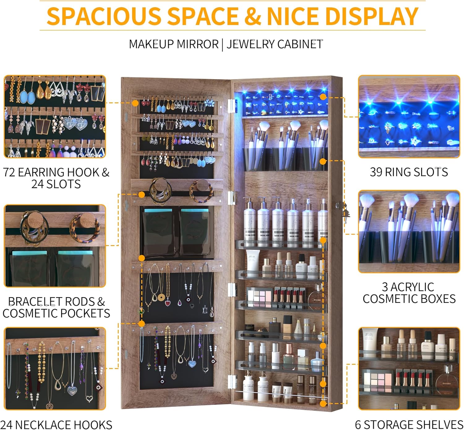 • Earring Storage – Large-capacity slots to hold all your favorite earrings.