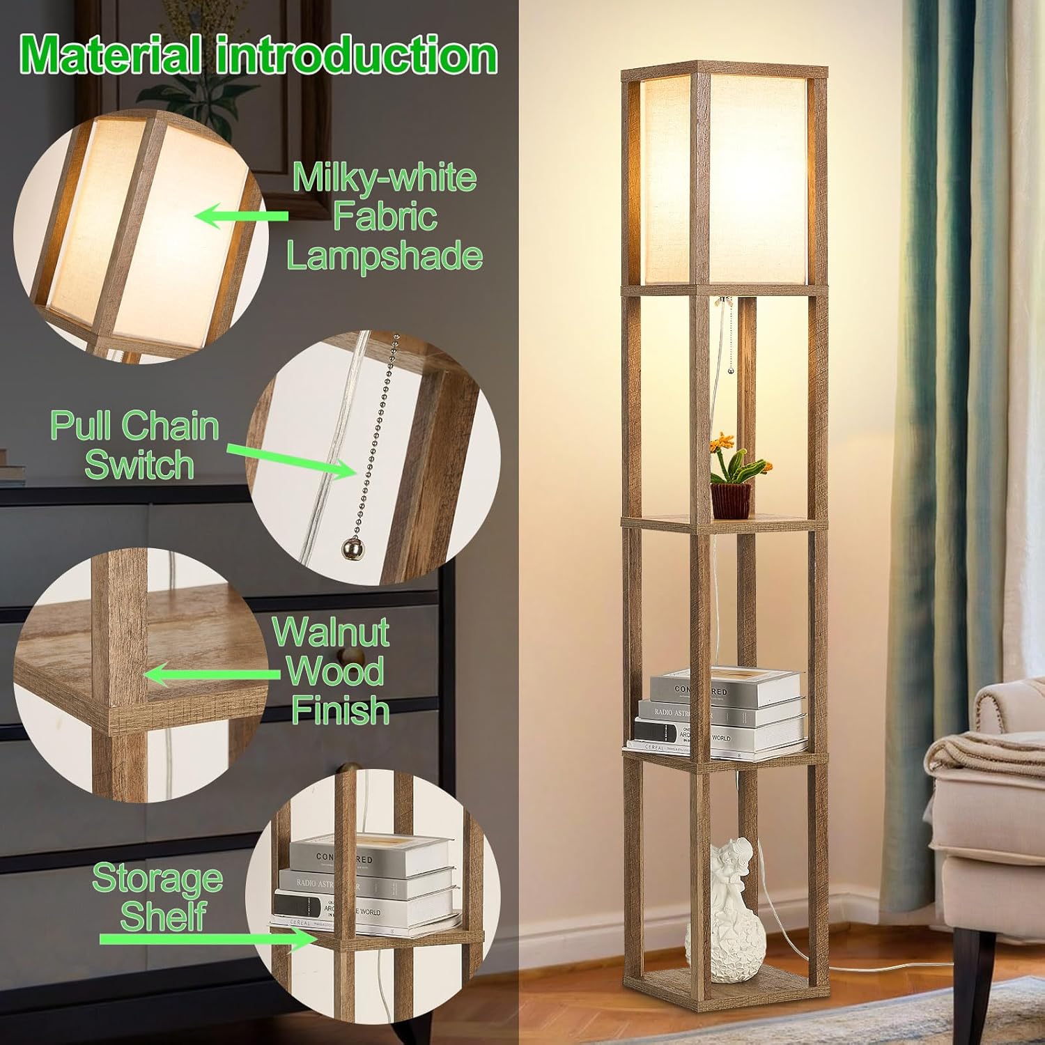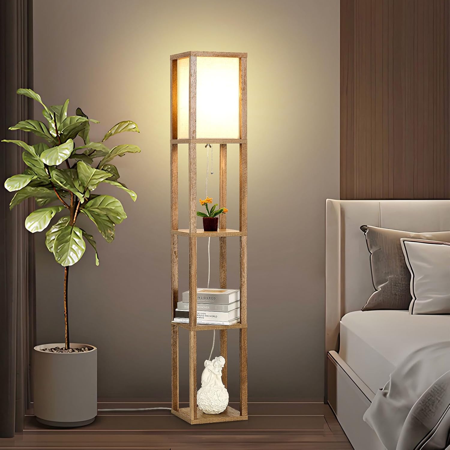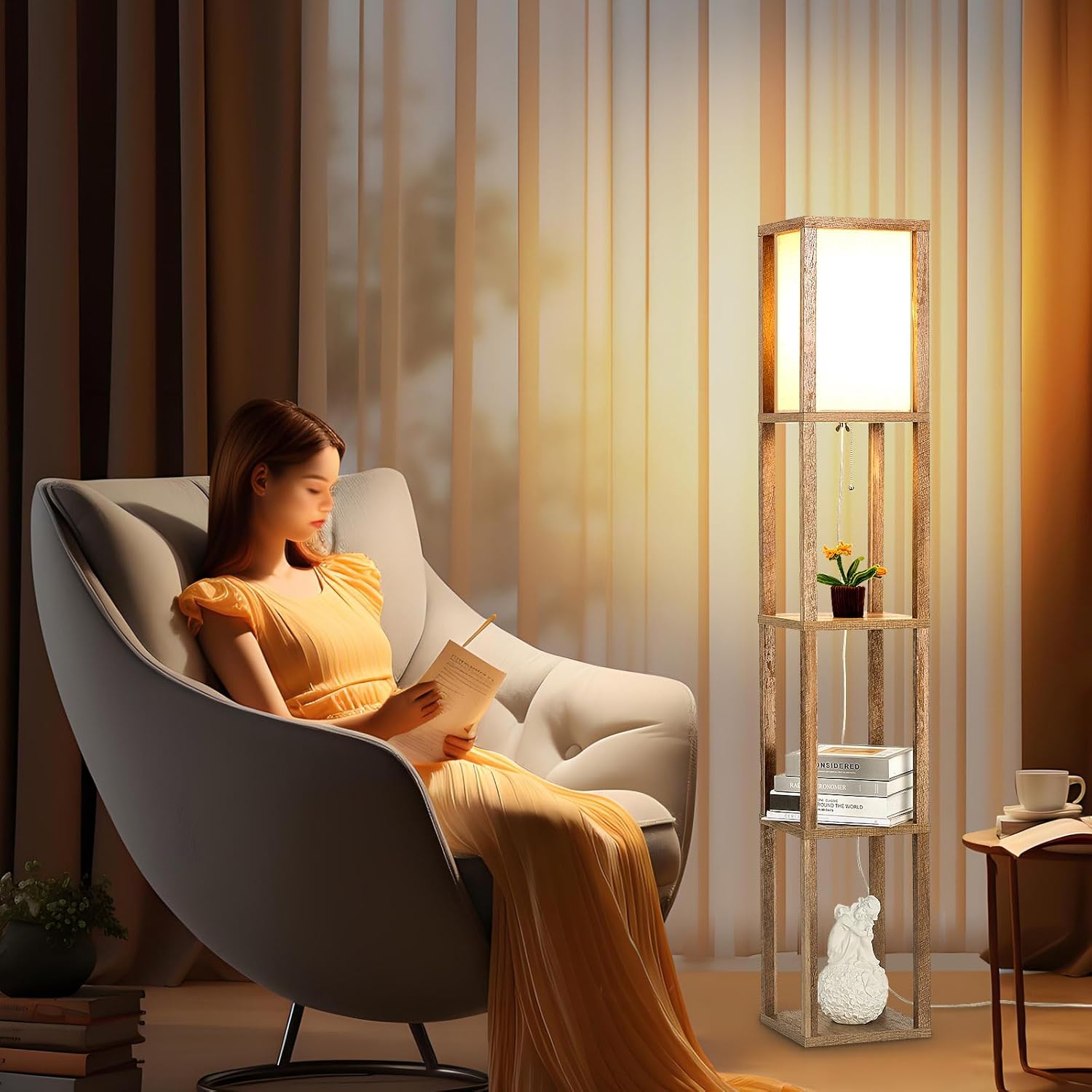 Struggling with harsh lighting or a lack of surfaces for your everyday items? This retro standing lamp provides a soft,warm glow through its high-quality linen fabric shade, creating an instant cozy and comfortable atmosphere perfect for relaxing, reading, or unwinding. More than just a light source, its unique 3-tiered shelving system offers ample space to display books, photo frames, potted plants, and more. Declutter your space and enjoy both style and functionality in one elegant design!