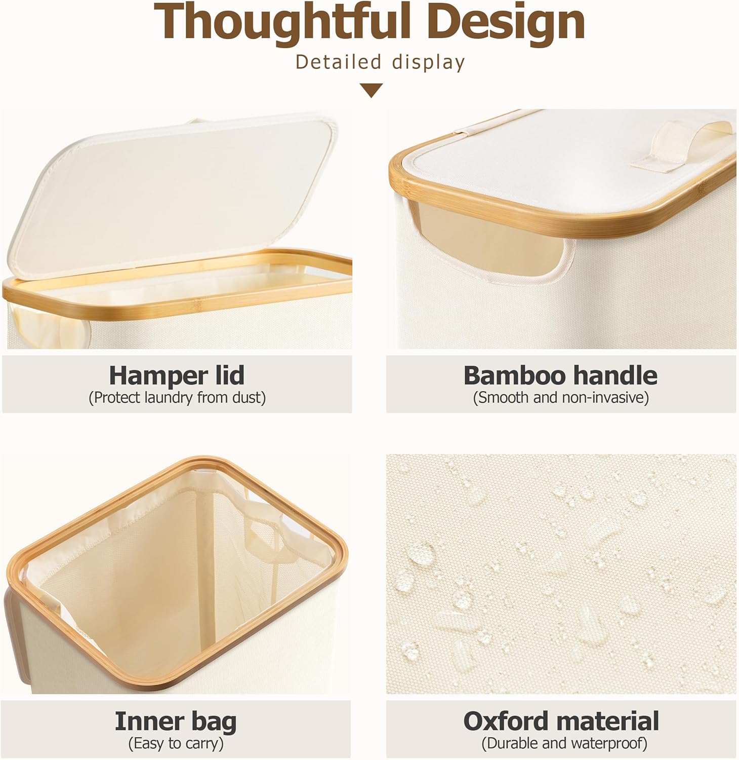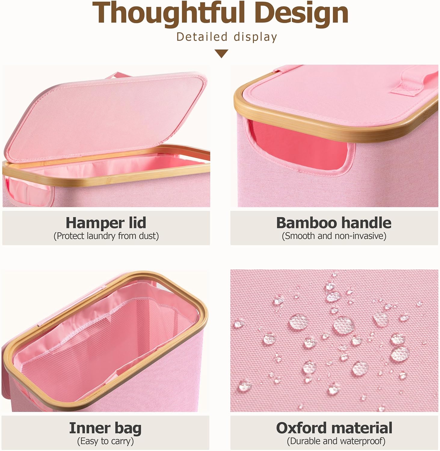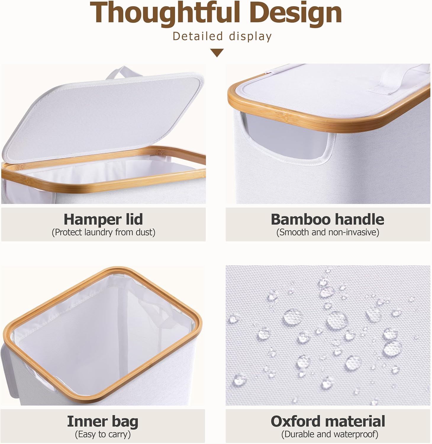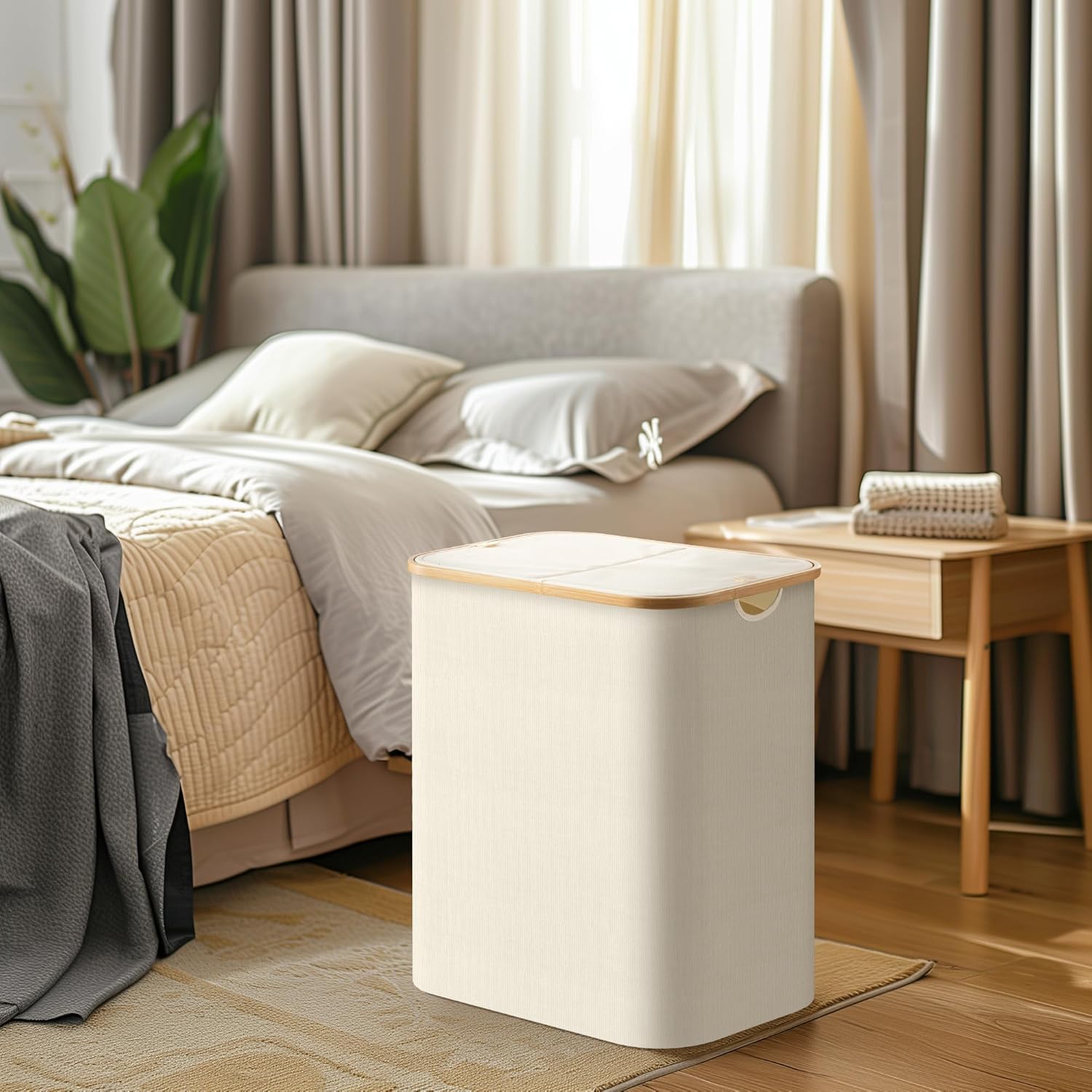 Maintain a tidy and inviting home environment with the integrated, sturdy lid. This practical feature not only conceals dirty laundry from view but also helps to contain any odours, keeping your space fresh. The lid is easy to open and close,and its flat surface even provides a convenient spot for decorating with small items, adding a touch of charm to your room. Elegant bamboo handles make transport effortless.