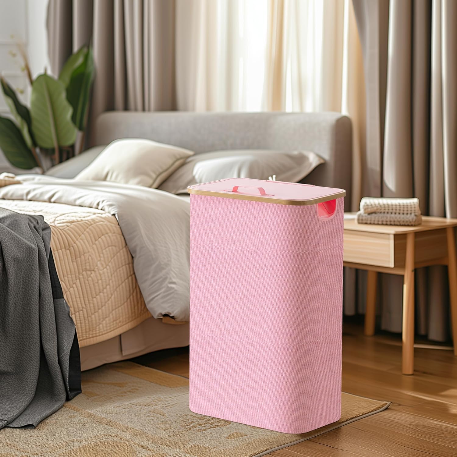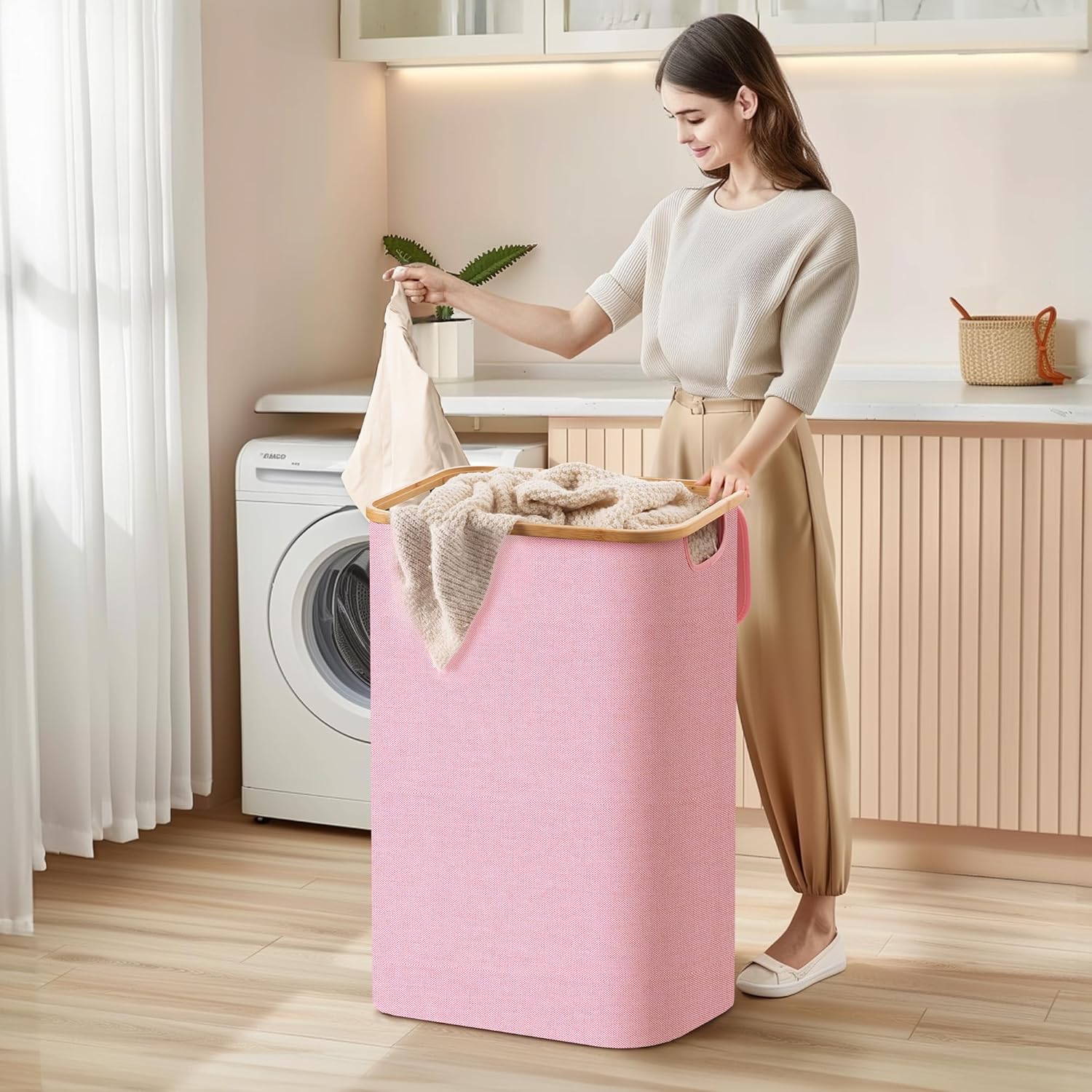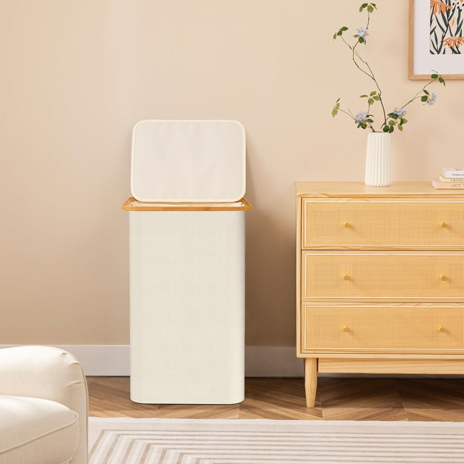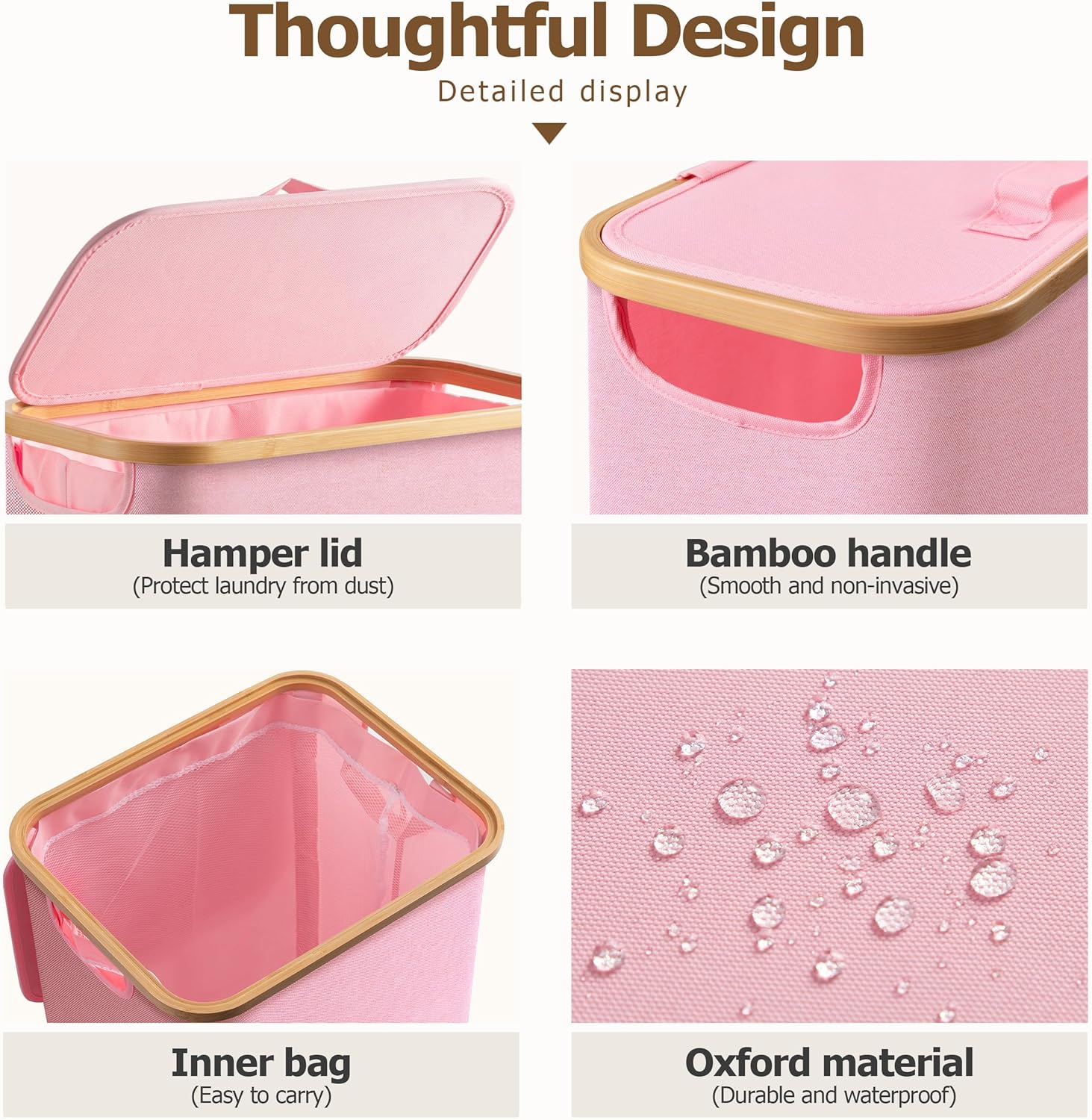 Maintain a tidy and inviting home environment with the integrated, sturdy lid. This practical feature not only conceals dirty laundry from view but also helps to contain any odours, keeping your space fresh. The lid is easy to open and close,and its flat surface even provides a convenient spot for decorating with small items, adding a touch of charm to your room. Elegant bamboo handles make transport effortless.