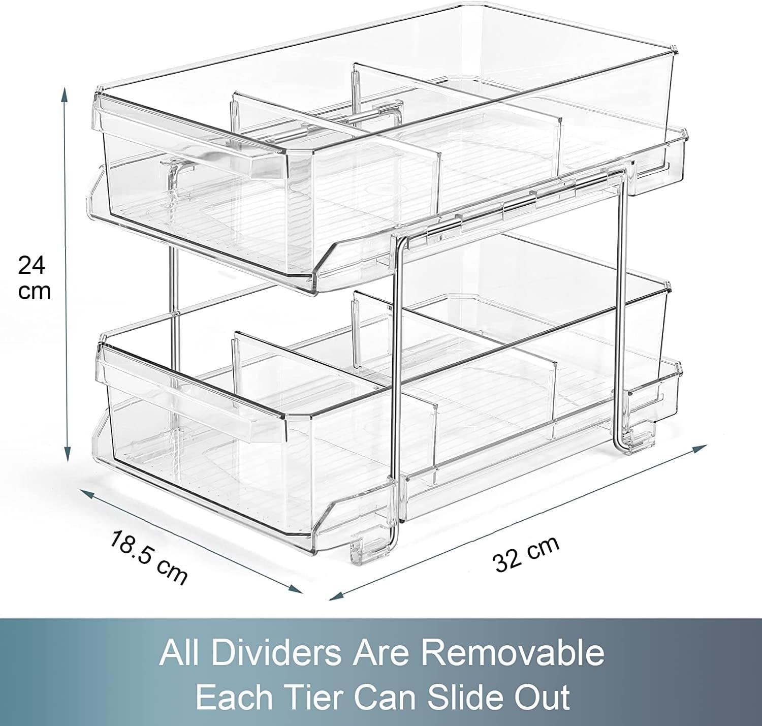 - 【More Storage Options】: This multi-use two tier sliding drawer organizer can help us organize space well in many places, such as refrigerator storage, under sink storage & organisation, office desk, snacks food, medicine cabinet organizer, spice rack organizing, etc.