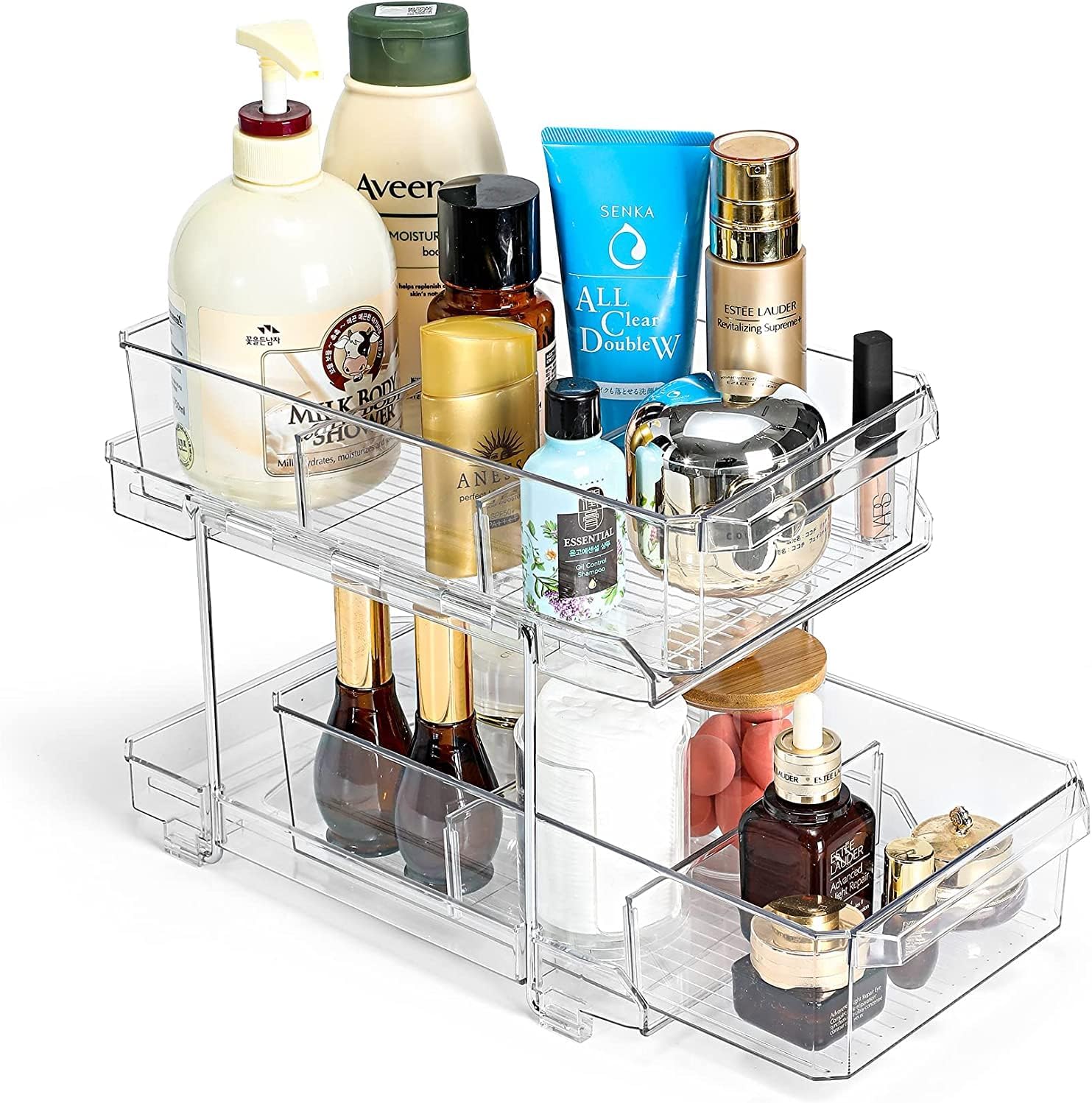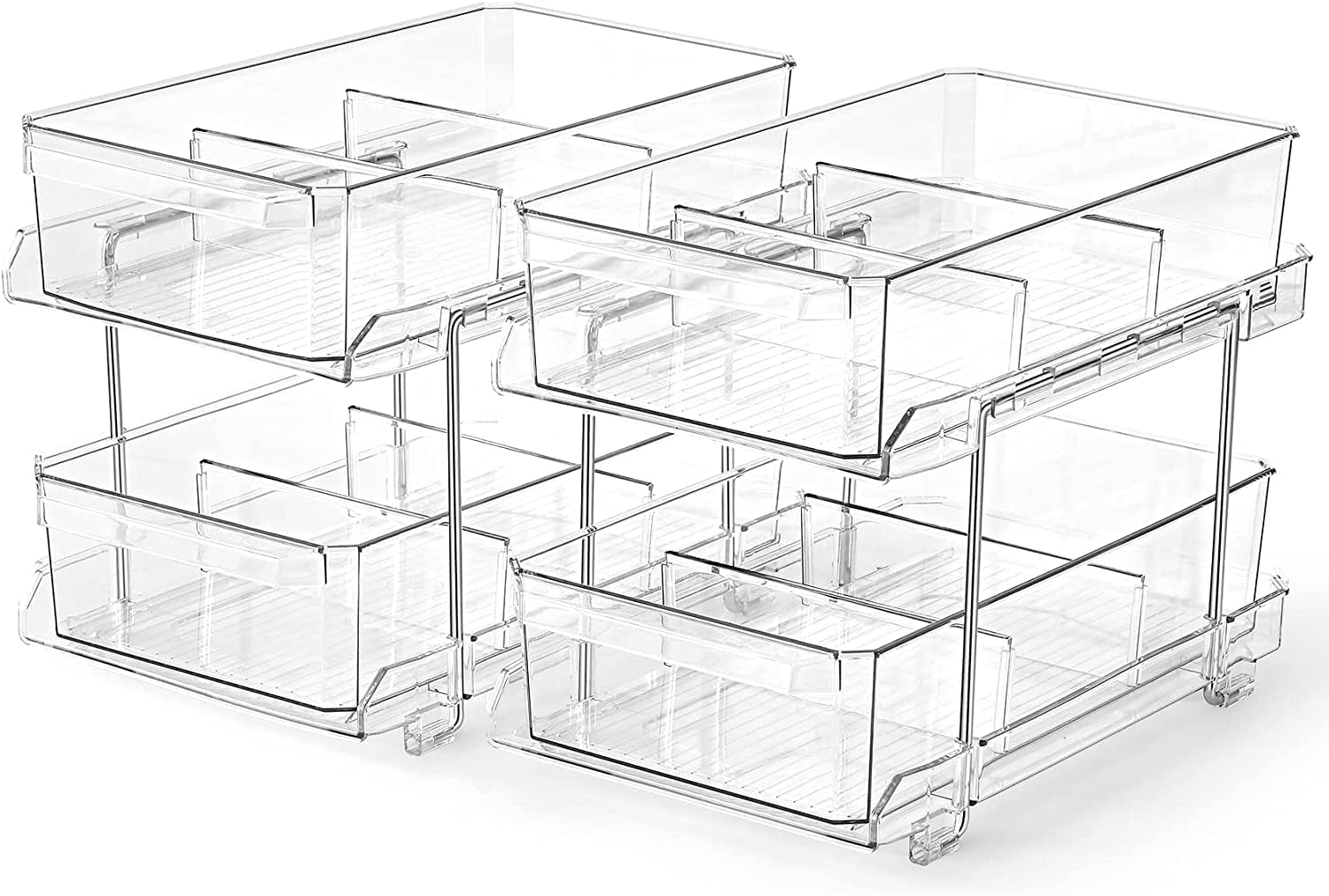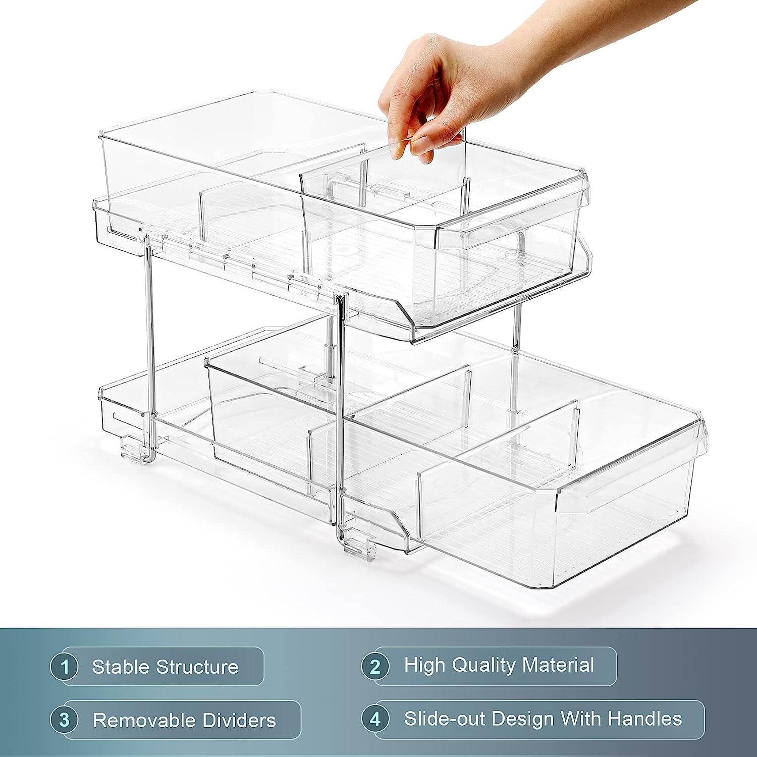 Feshory 2 Tier Clear Pull Out Cabinet Organizer for Pantry [2 Pack], Kitchen Storage & Organisation - Under Sink Storage Drawer for Countertop, Medicine, Bathroom (Acrylic)