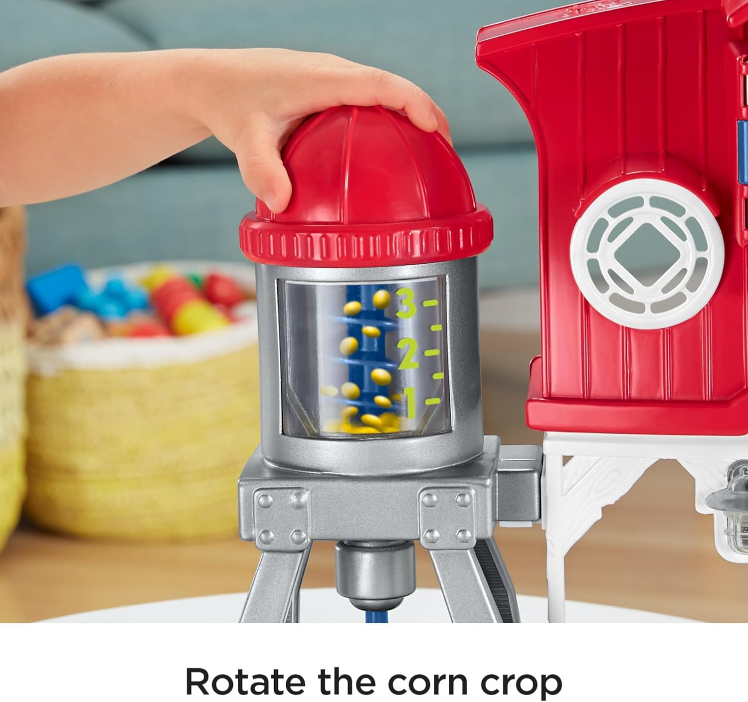 - Multiple play points: Press the barn door button or drop figures through the hayloft for songs, sounds and phrases. Turn on the barn light, “hatch” the chicks, and “pop” the corn in the spinning silo