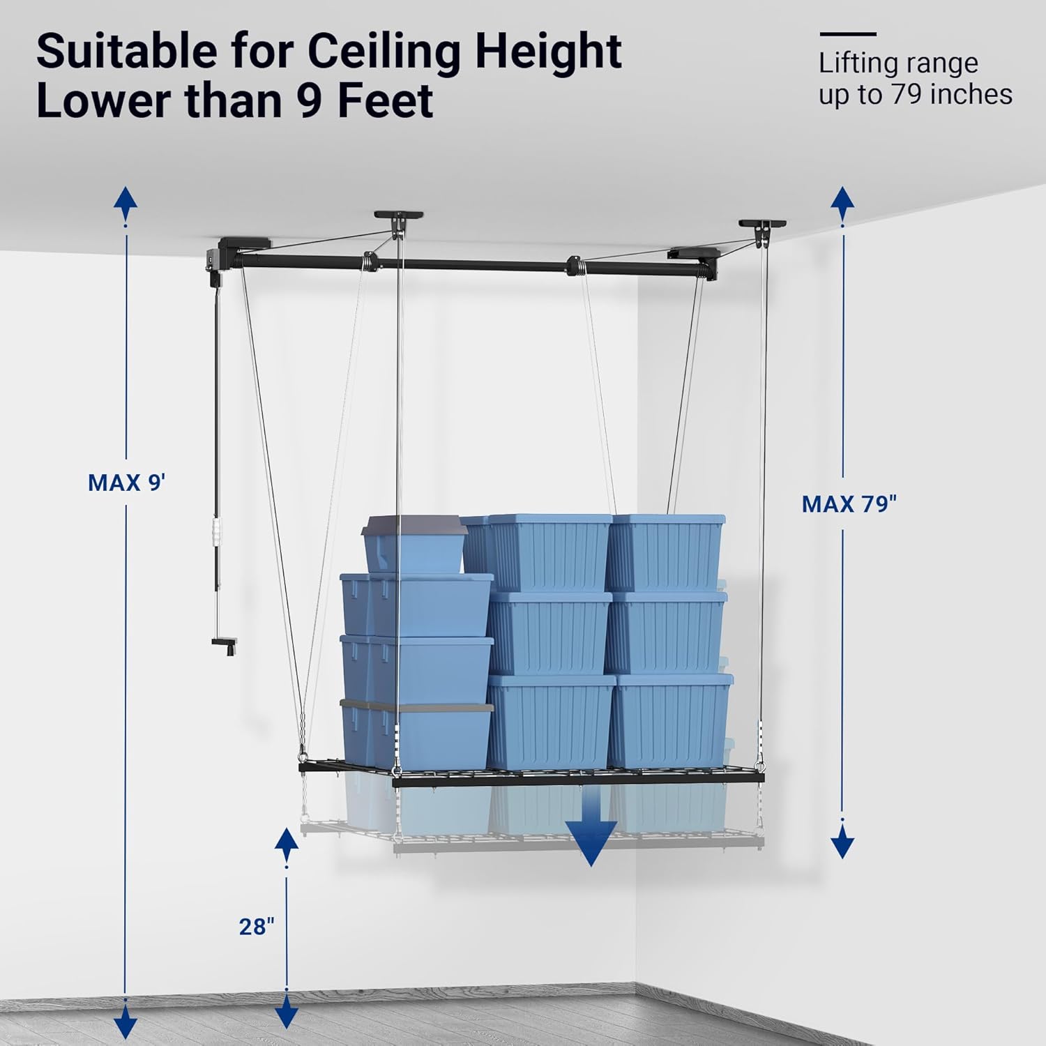 FLEXIMOUNTS GL1 Overhead Garage Lifting Storage Rack, 4x4 Ft Heavy-Duty Metal Garage Ceiling Rack, Adjustable Organization System, 300lbs Weight, Black