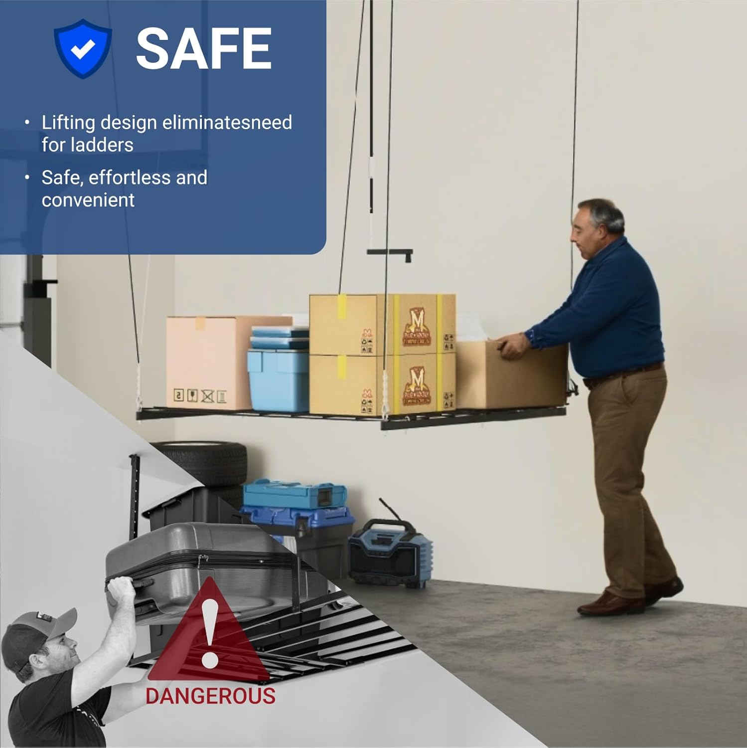 The FLEXIMOUNTS overhead lifting storage rack is the ideal system for you to have a highly organized and clean garage. This durable and heavy-duty overhead storage system easily raises and lowers the deck, eliminating the need for a ladder.
