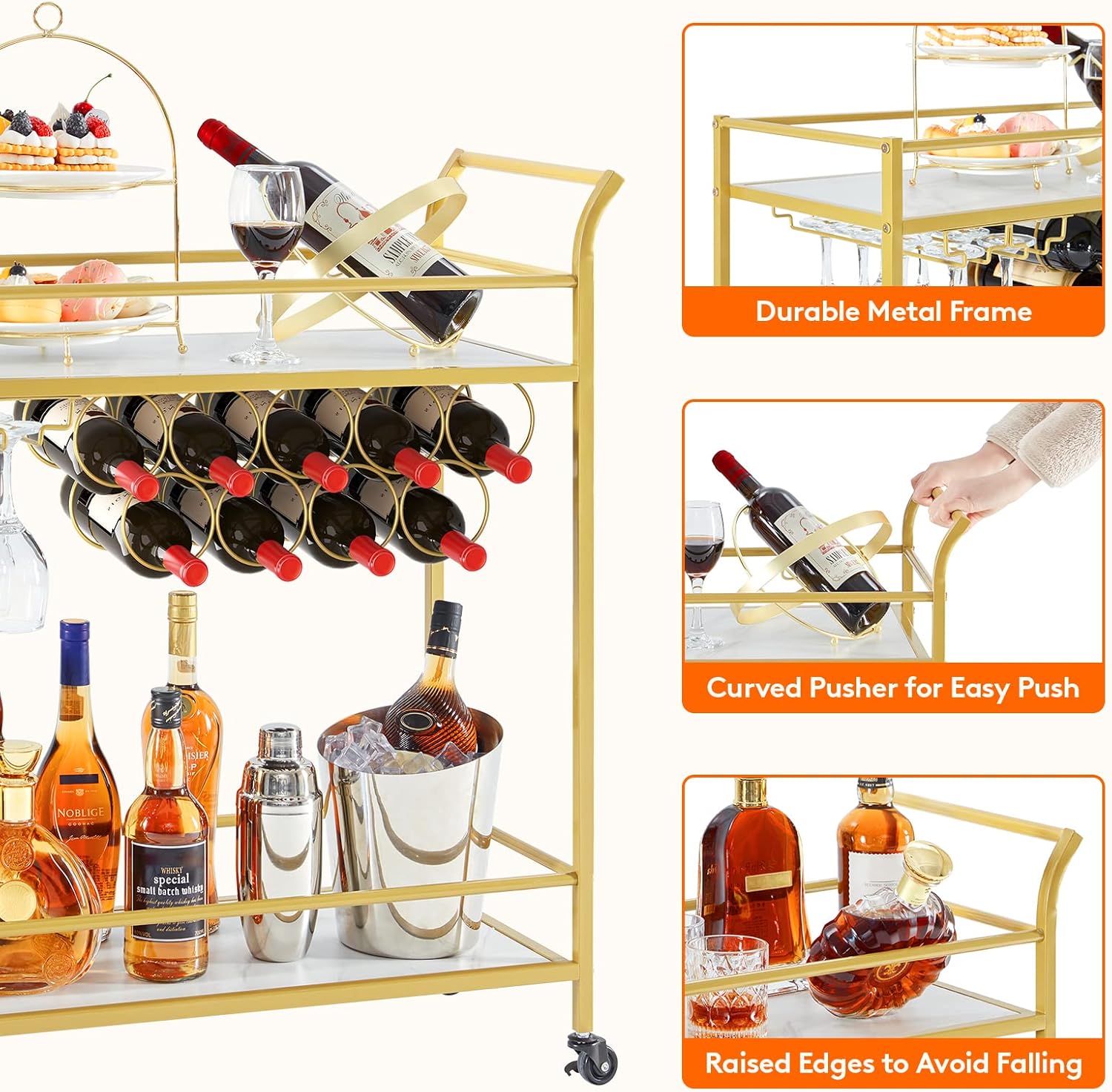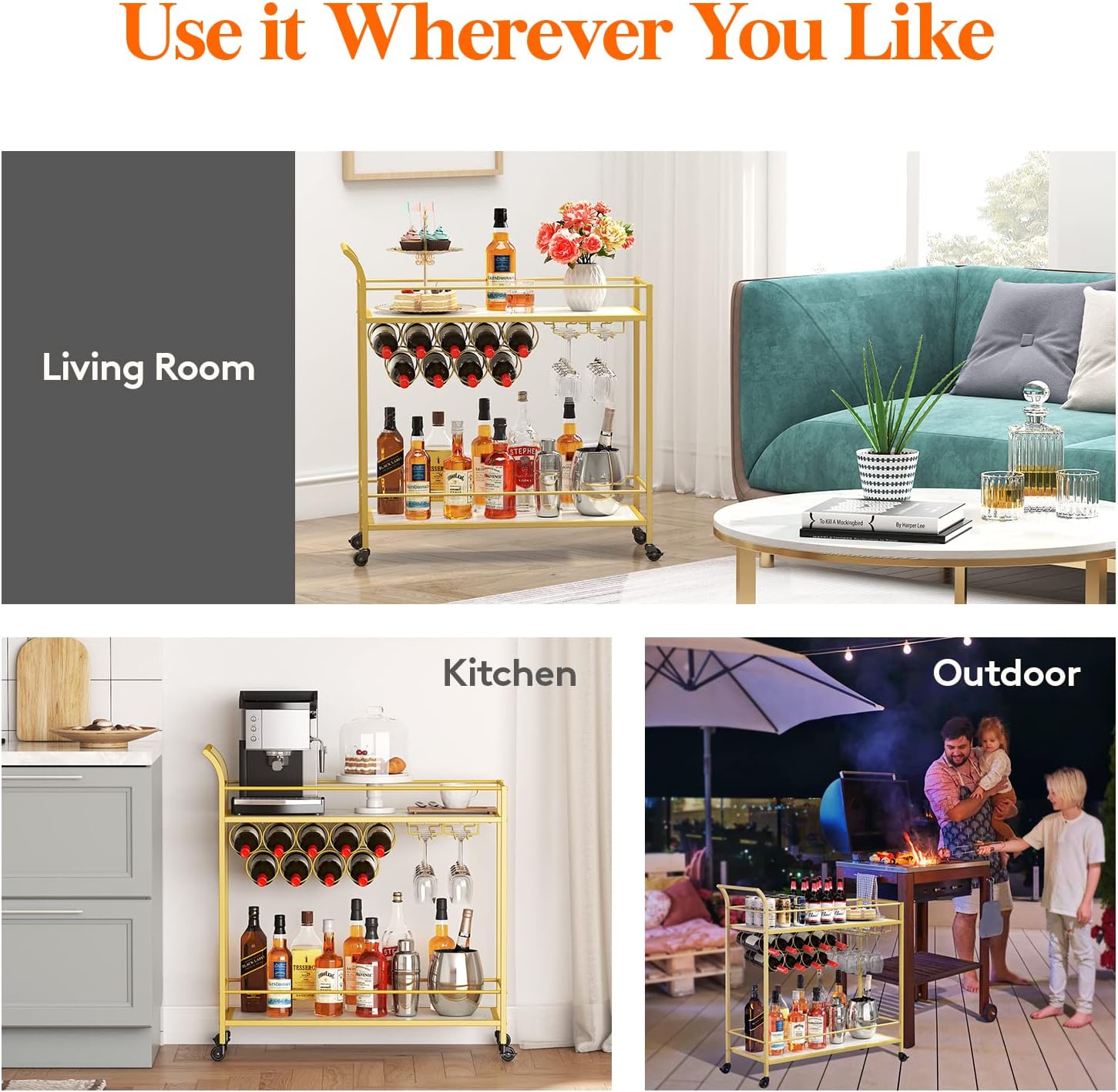 Drinks Trolley on Wheels | Gold 2-Tier Bar Cart with Wine Racks