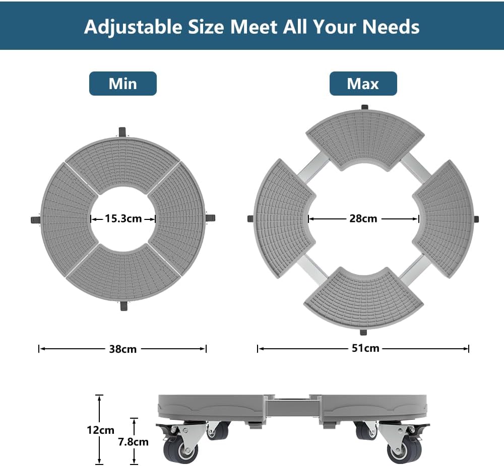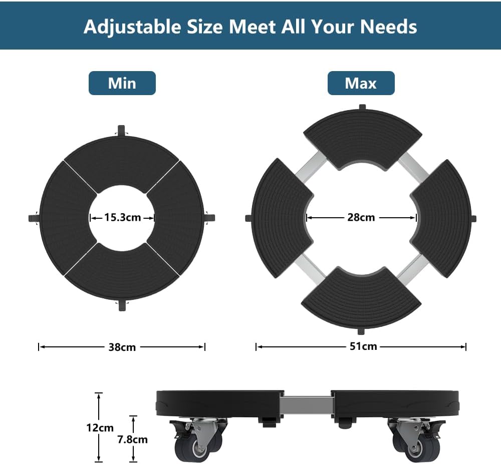 Adaptable Size for Large Planters: The adjustable plant base expands from 38cm to 50cm in diameter, with a central opening of 15.2cm - 28cm. This versatile plant trolley easily accommodates a wide variety of large pots and planters with wheels.