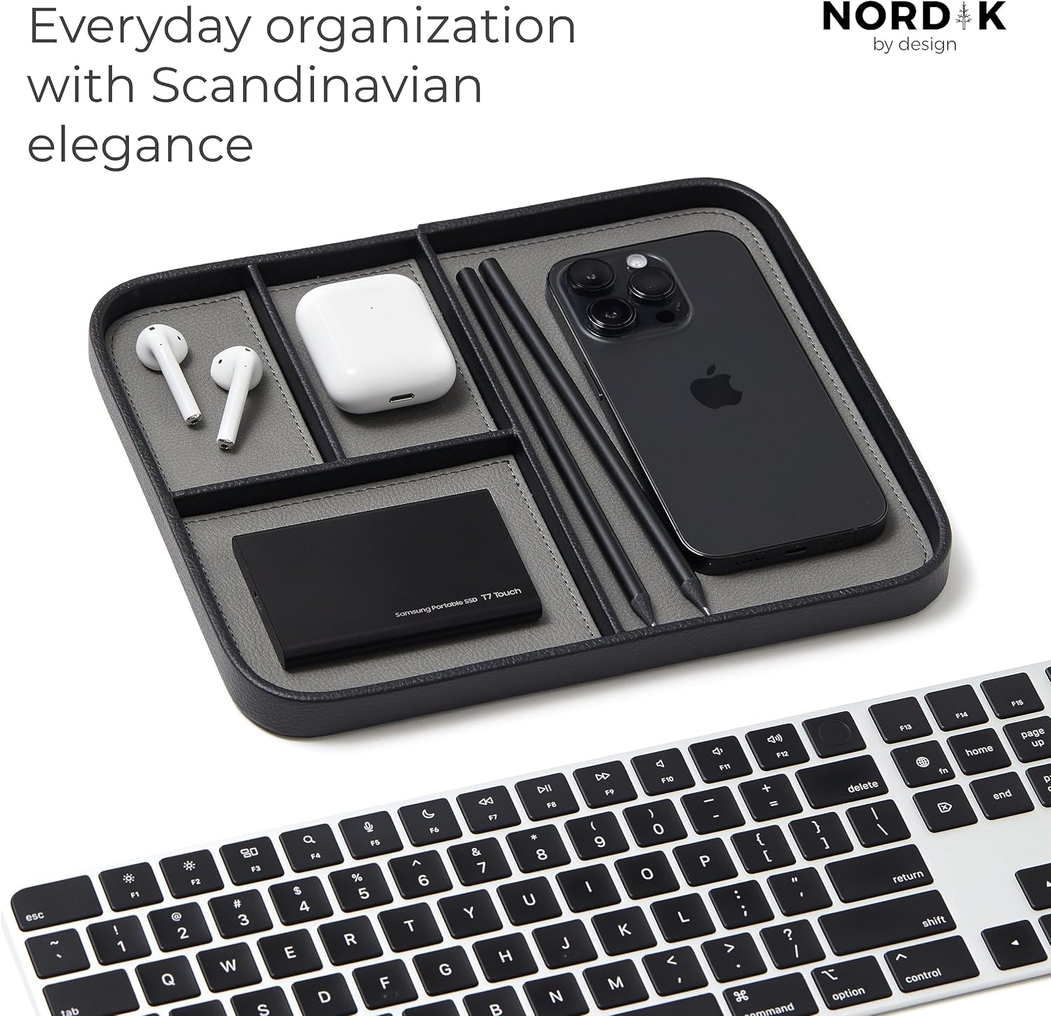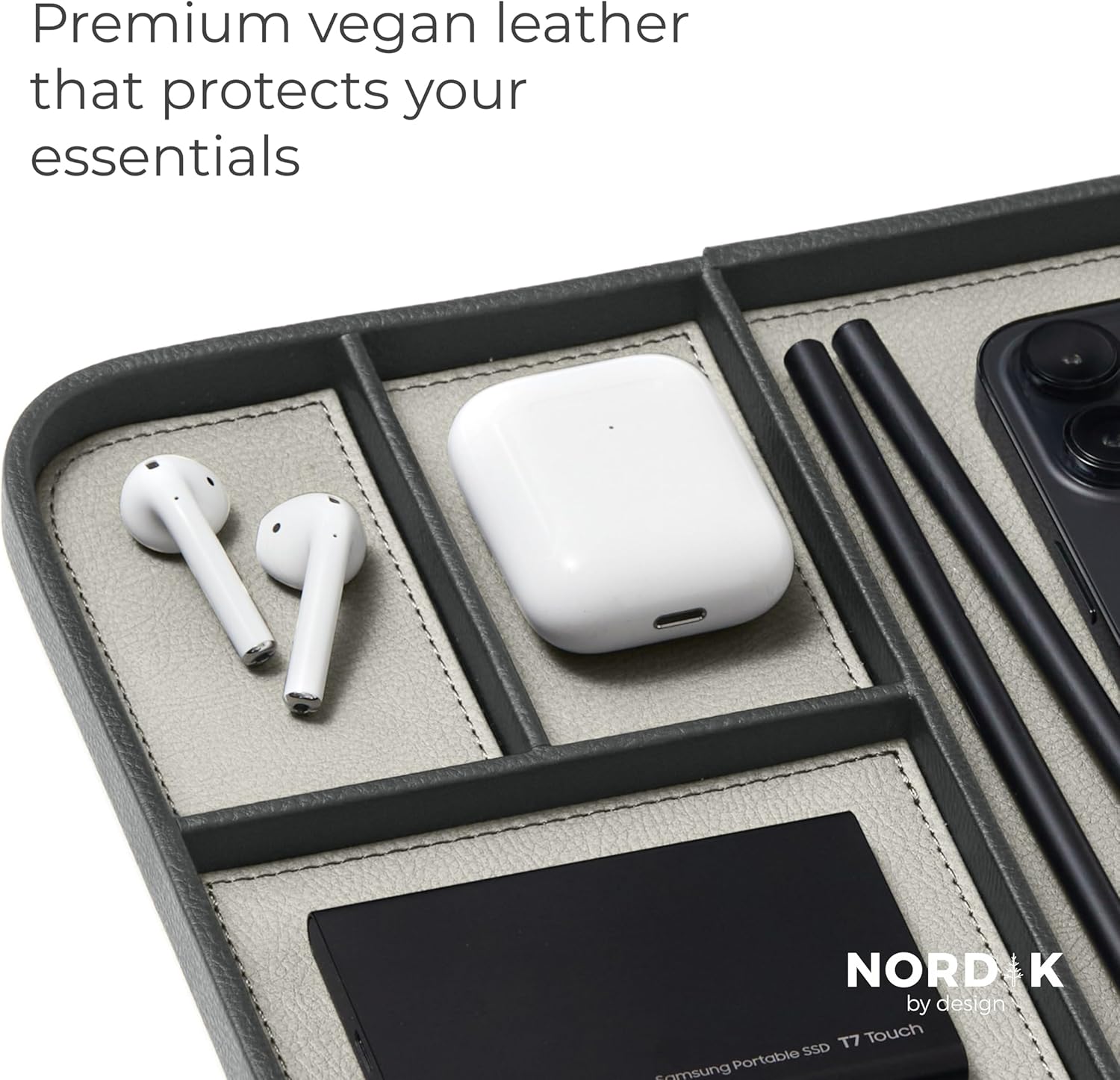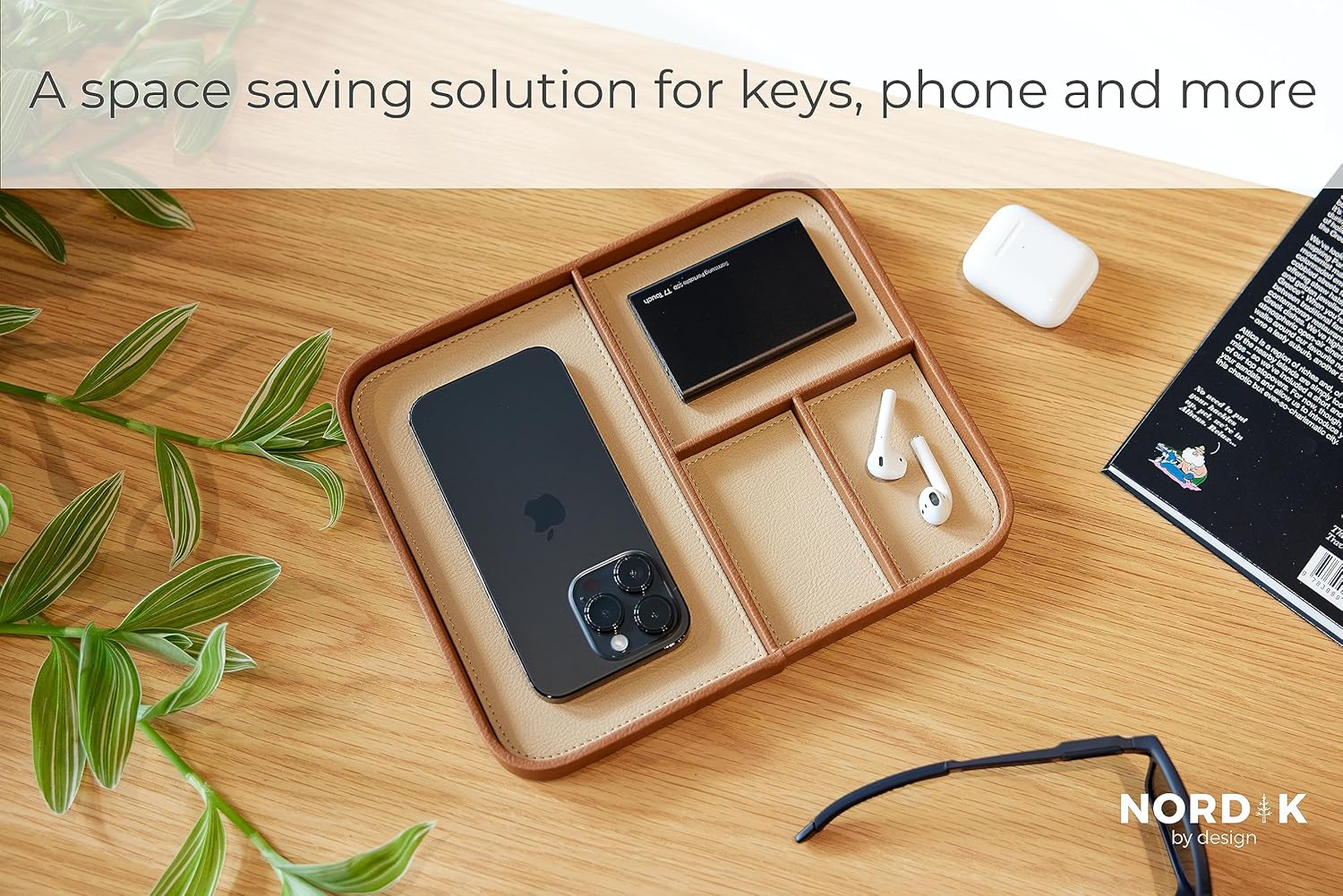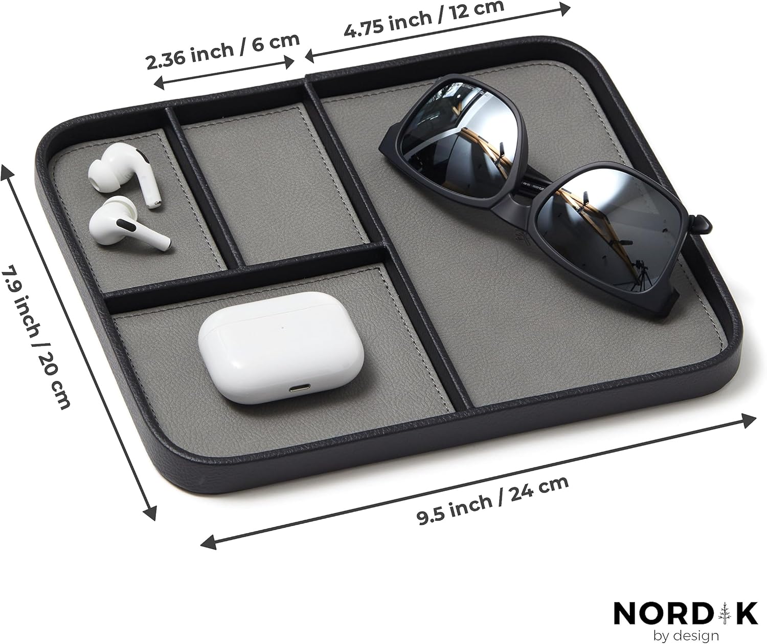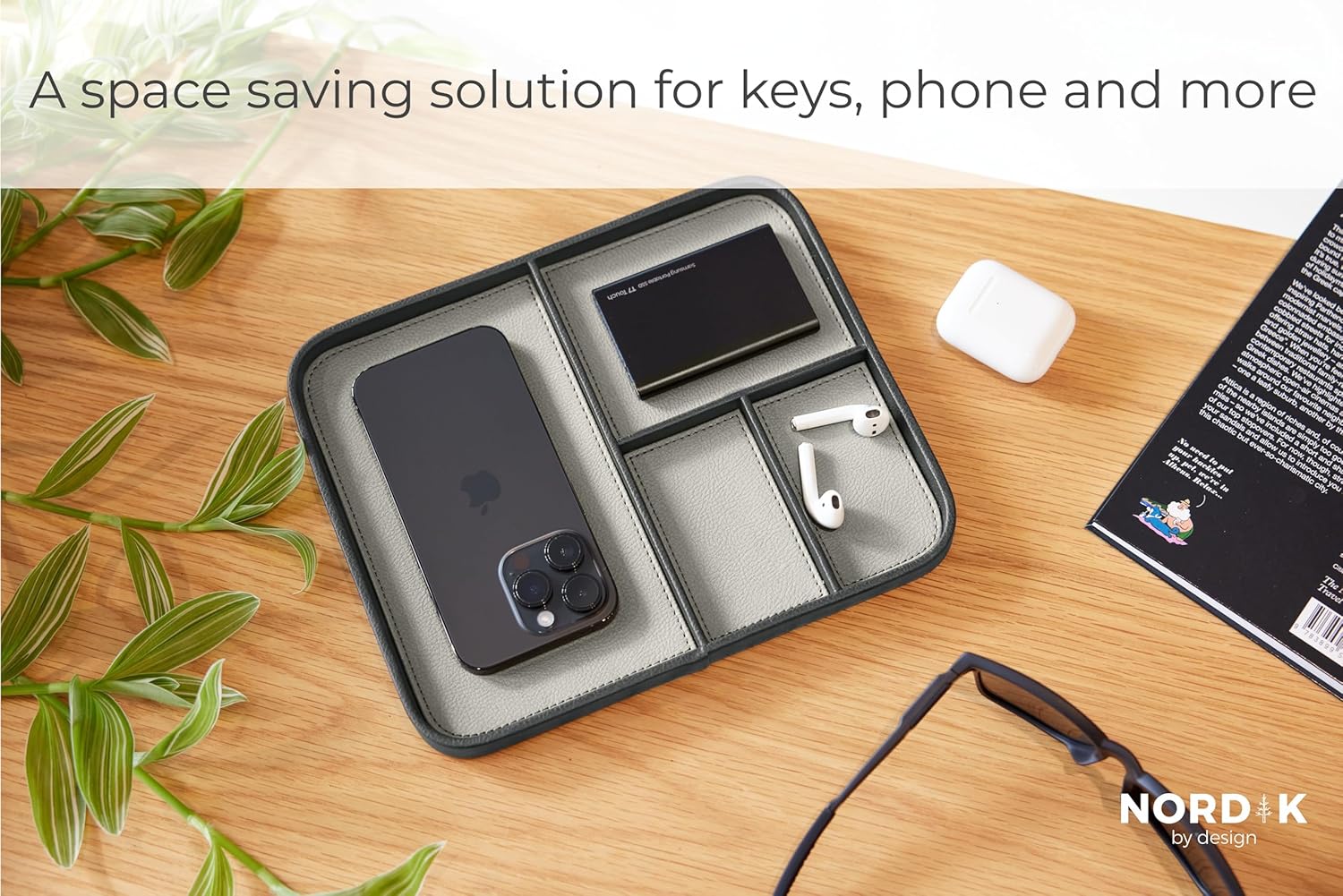 Are your keys, wallet, phone, and watch scattered across your nightstand or desk, making your mornings a frantic search mission? Do you wish for a designated spot where your everyday essentials are not only organised but also protected and easily accessible? Imagine starting your day with everything neatly in its place, giving you back precious time and reducing stress. Our elegant vegan leather valet tray is the perfect solution to bring sophisticated order to your most important items. Don't let clutter dictate your daily routine any longer – simplify your life and elevate your space today!