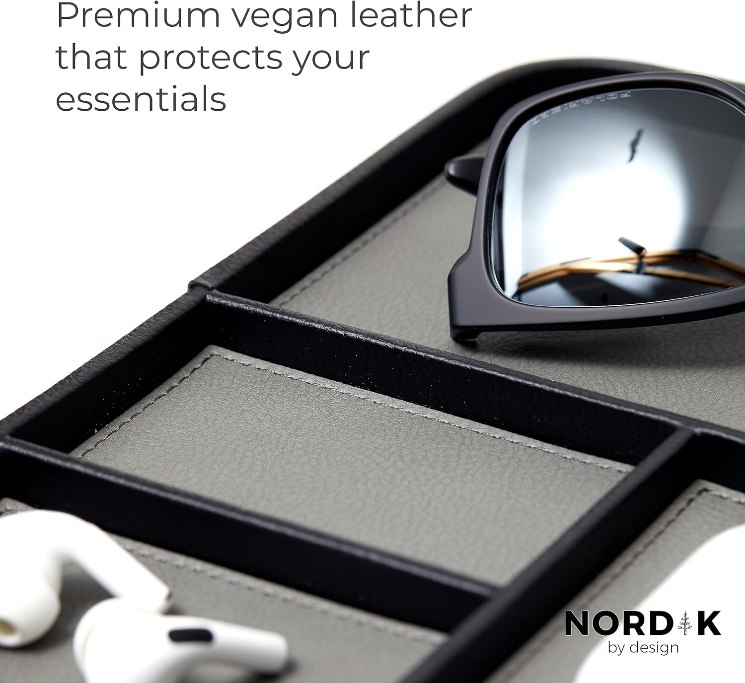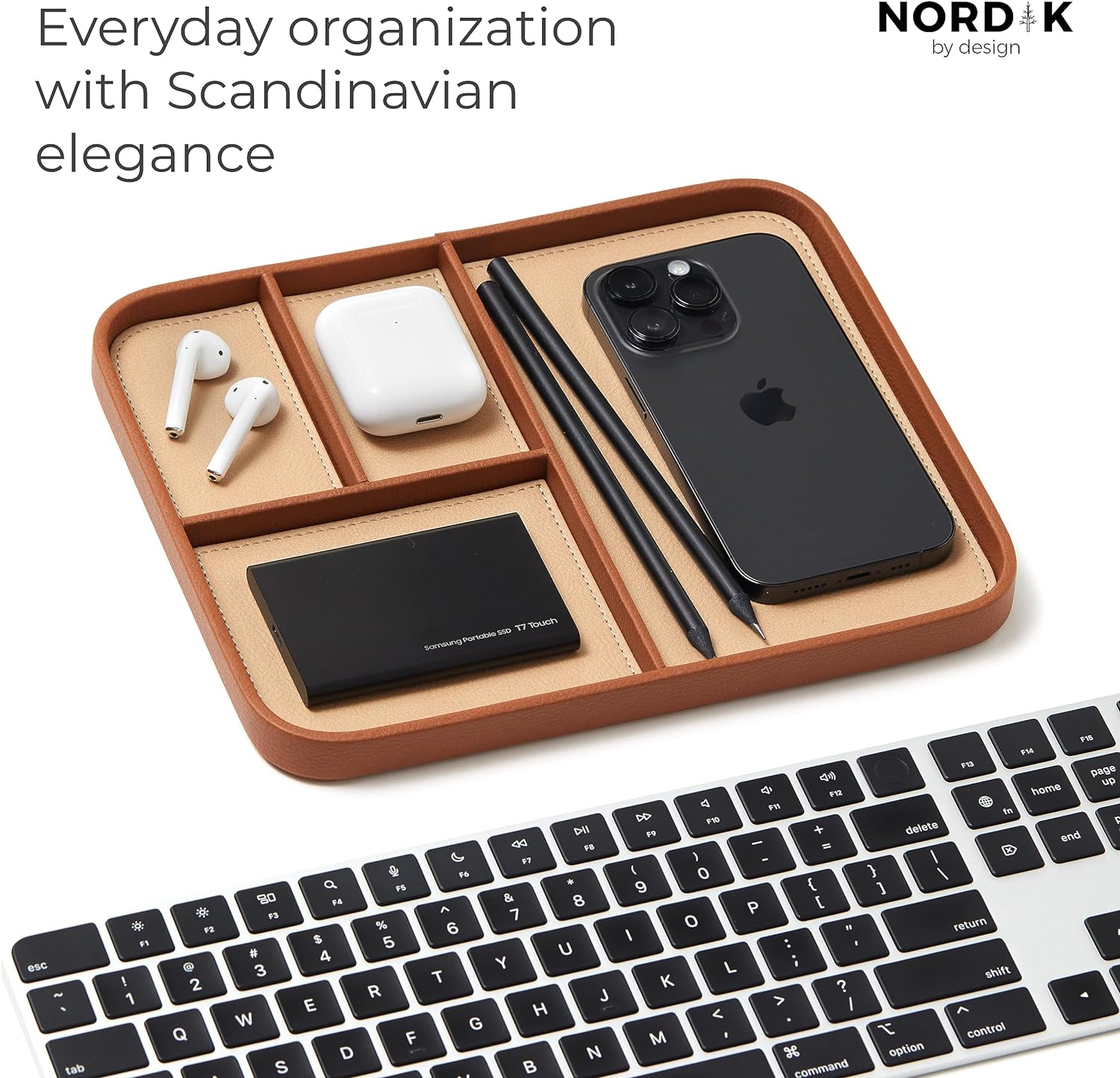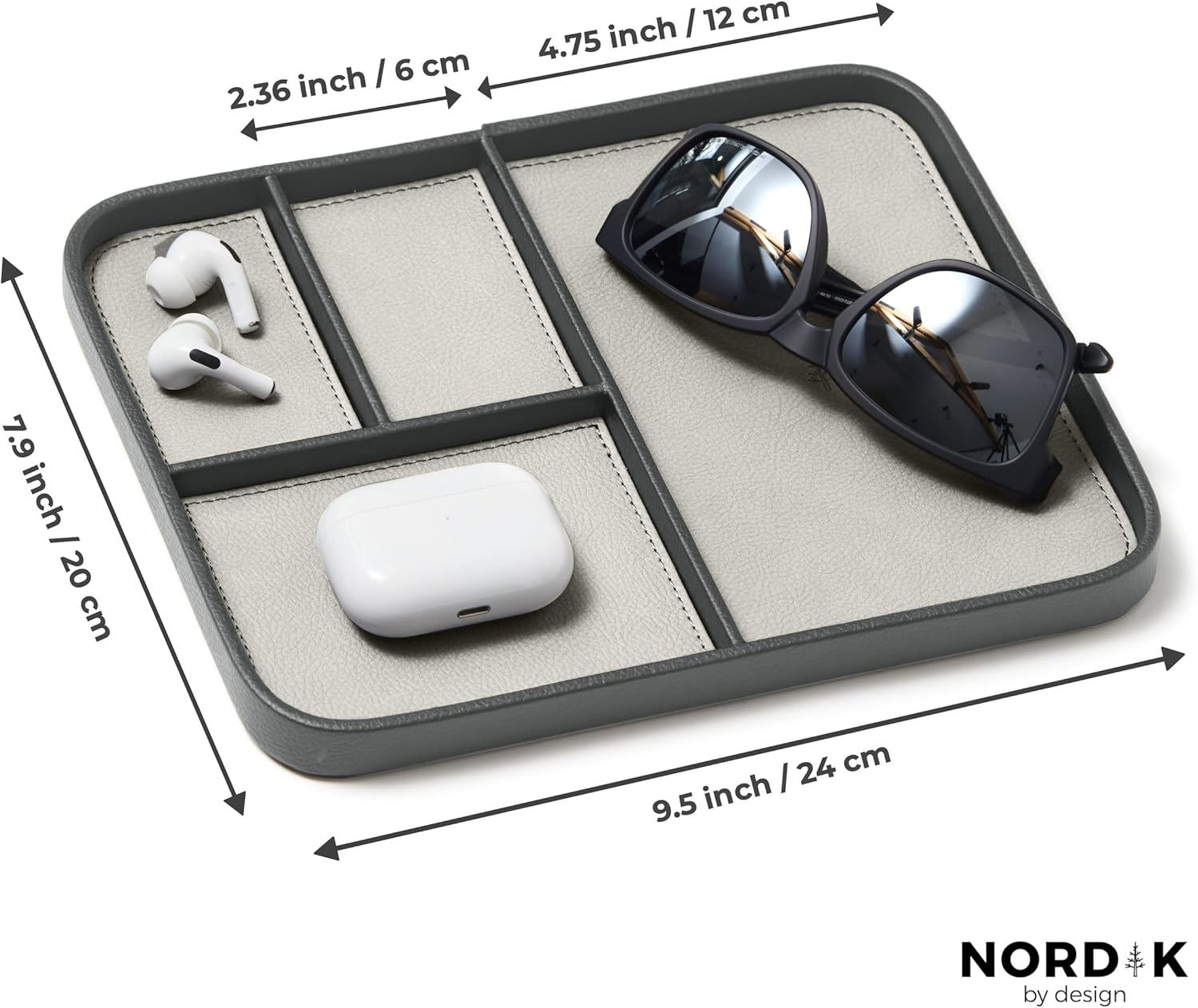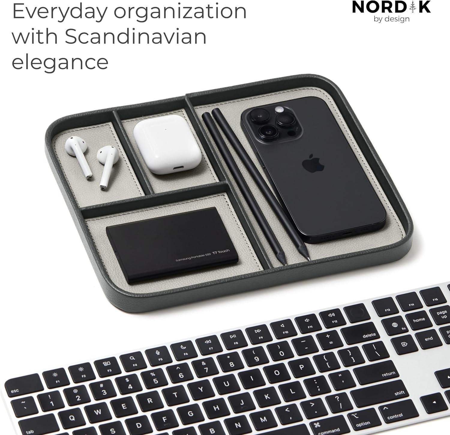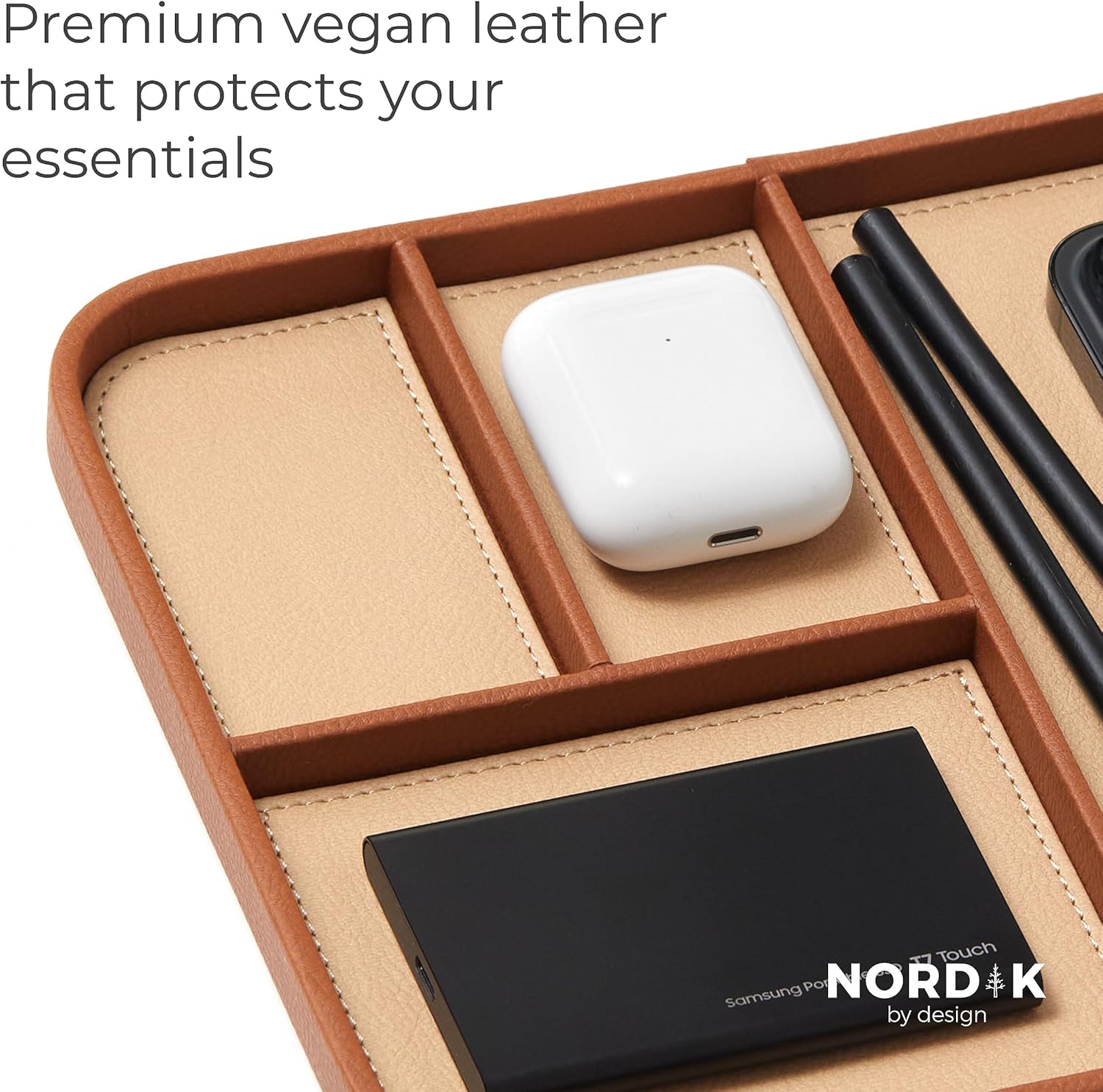 Are your keys, wallet, phone, and watch scattered across your nightstand or desk, making your mornings a frantic search mission? Do you wish for a designated spot where your everyday essentials are not only organised but also protected and easily accessible? Imagine starting your day with everything neatly in its place, giving you back precious time and reducing stress. Our elegant vegan leather valet tray is the perfect solution to bring sophisticated order to your most important items. Don't let clutter dictate your daily routine any longer – simplify your life and elevate your space today!