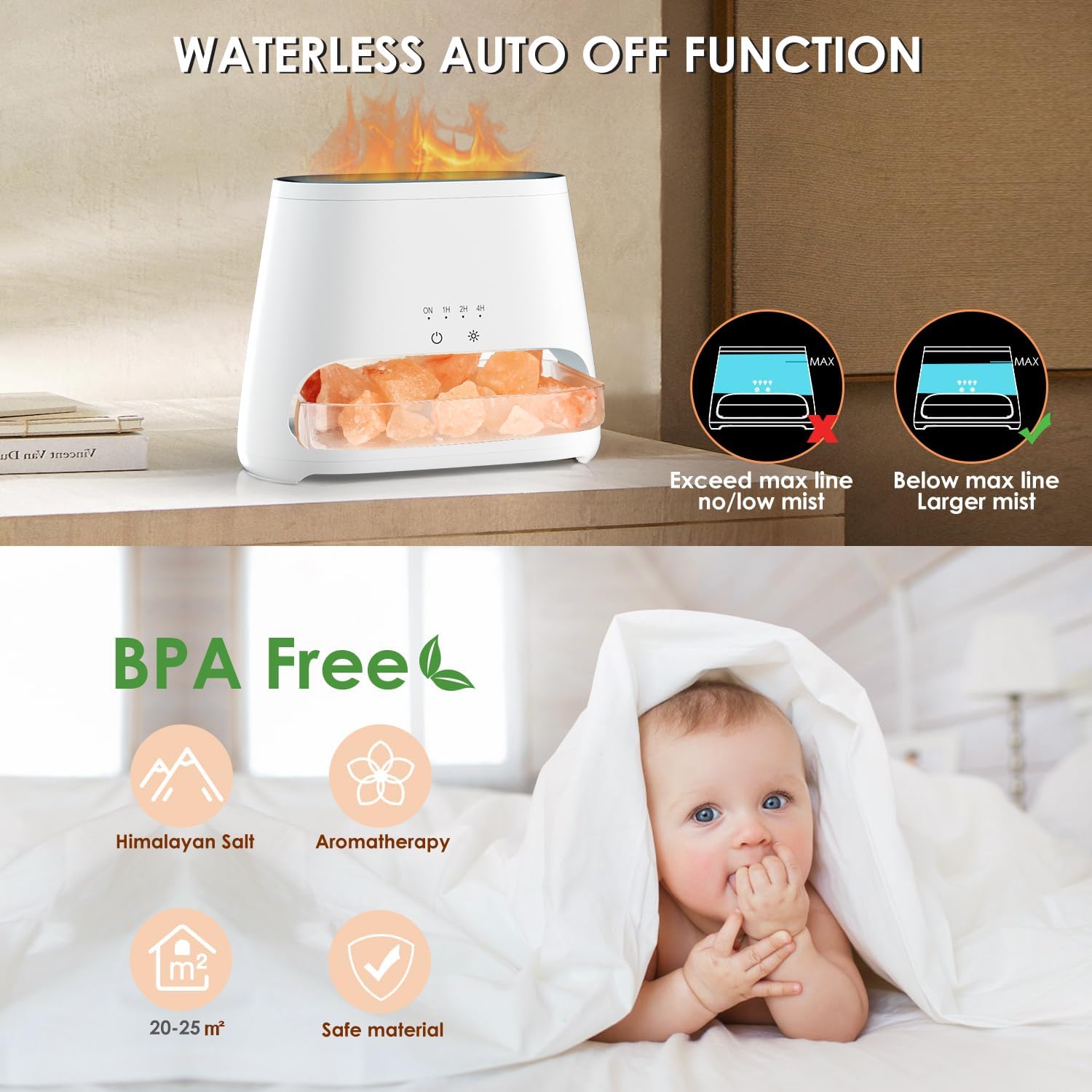 - 🔥Eye-Catching Simulation Flame Effect:Experience the magic of our salt therapy lamp and aromatherapy diffuser with its captivating flame effect. The combination of LED lights and water vapor creates a realistic and mesmerizing flame-like glow, adding a touch of elegance to any room. Choose from four timer settings to effortlessly set the mood(ON/1H/2H/4H). With a noise-proof structure below 20 decibels, you can enjoy the peaceful atmosphere created by its ultra-quiet operation. It is the perfect addition to your bedroom for a peaceful sleep.