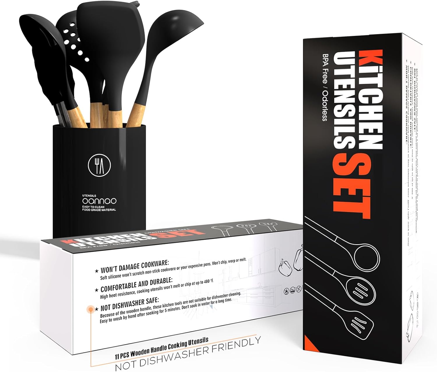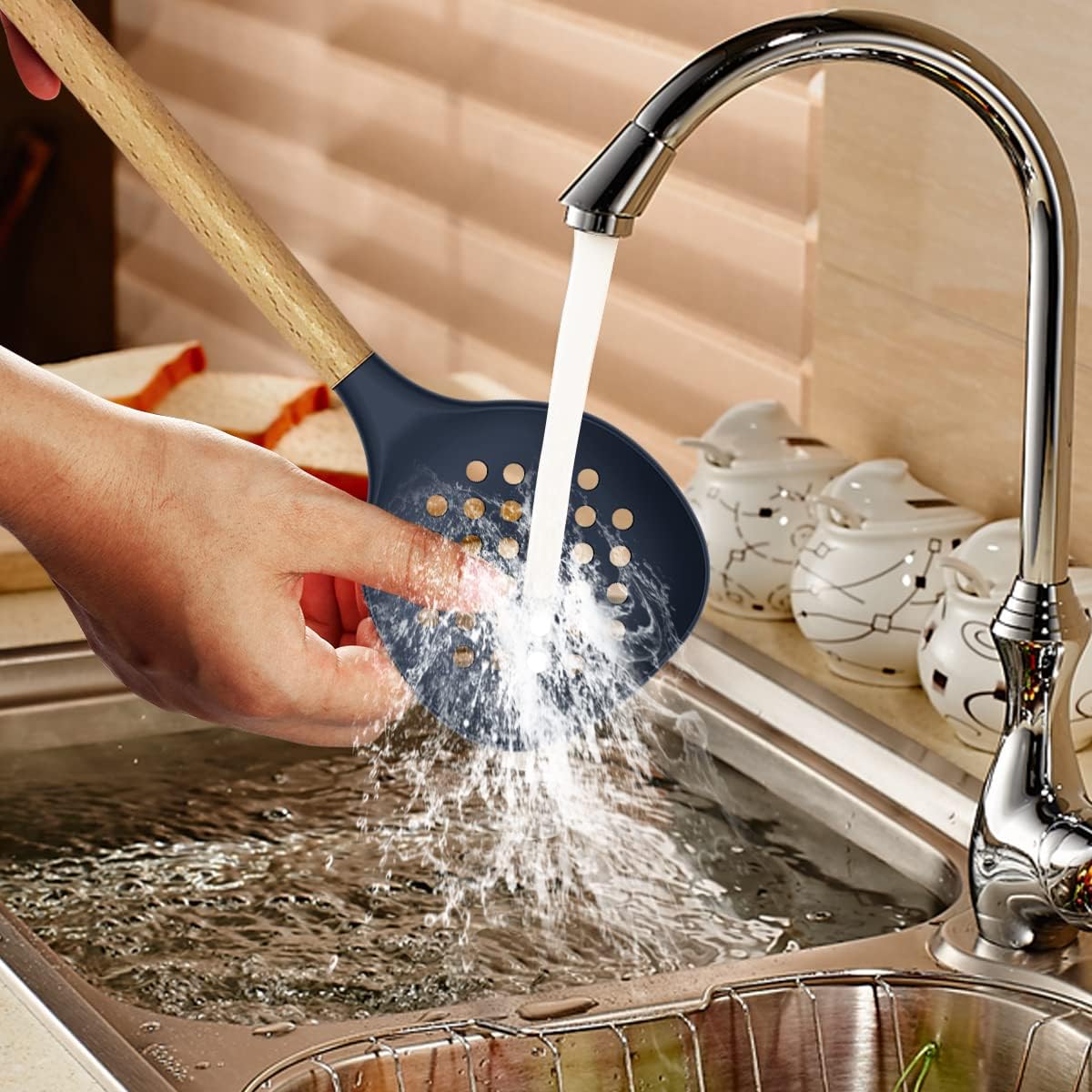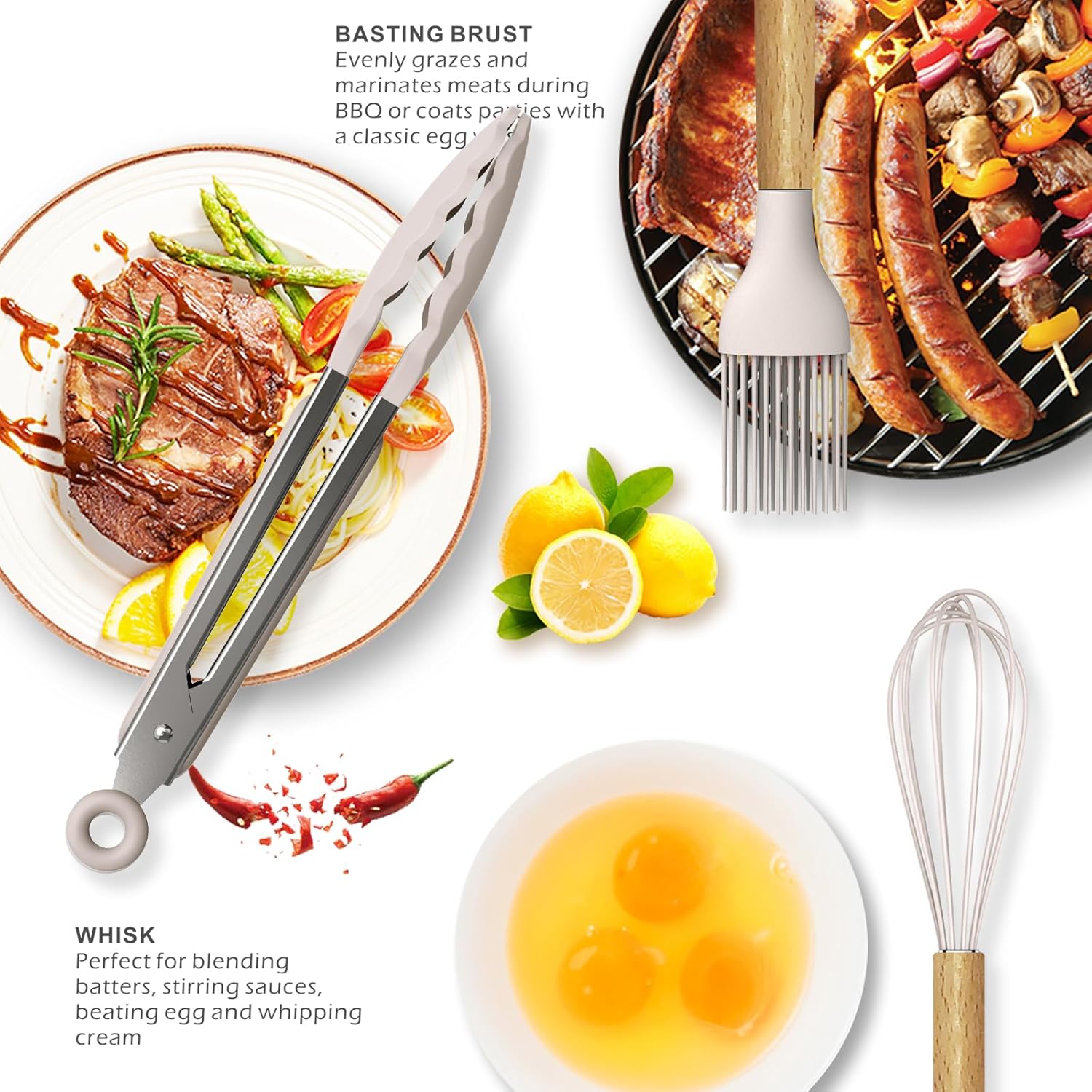 Comfort in the kitchen makes all the difference. Each utensil features a beautiful, natural wooden handle that provides a comfortable grip and prevents heat transfer, making your cooking experience safer and more enjoyable. While the wooden handles require hand washing (not suitable for dishwashers to maintain their integrity and natural beauty), the one-piece, no-gap design of the silicone heads ensures they are incredibly easy to clean, preventing food from getting trapped. Simply wash, dry, and enjoy! (Note: the small spatula, food tongs, and utensil holder are dishwasher safe for added convenience).