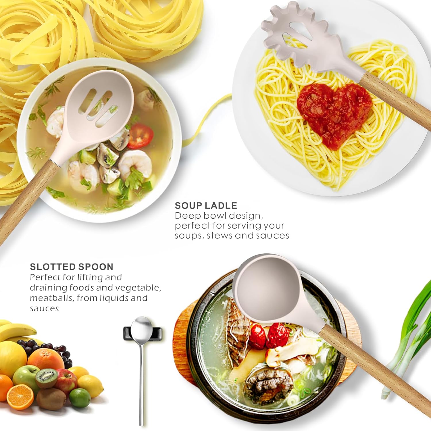 14-Piece Silicone Kitchen Utensil Set with Wooden Handles