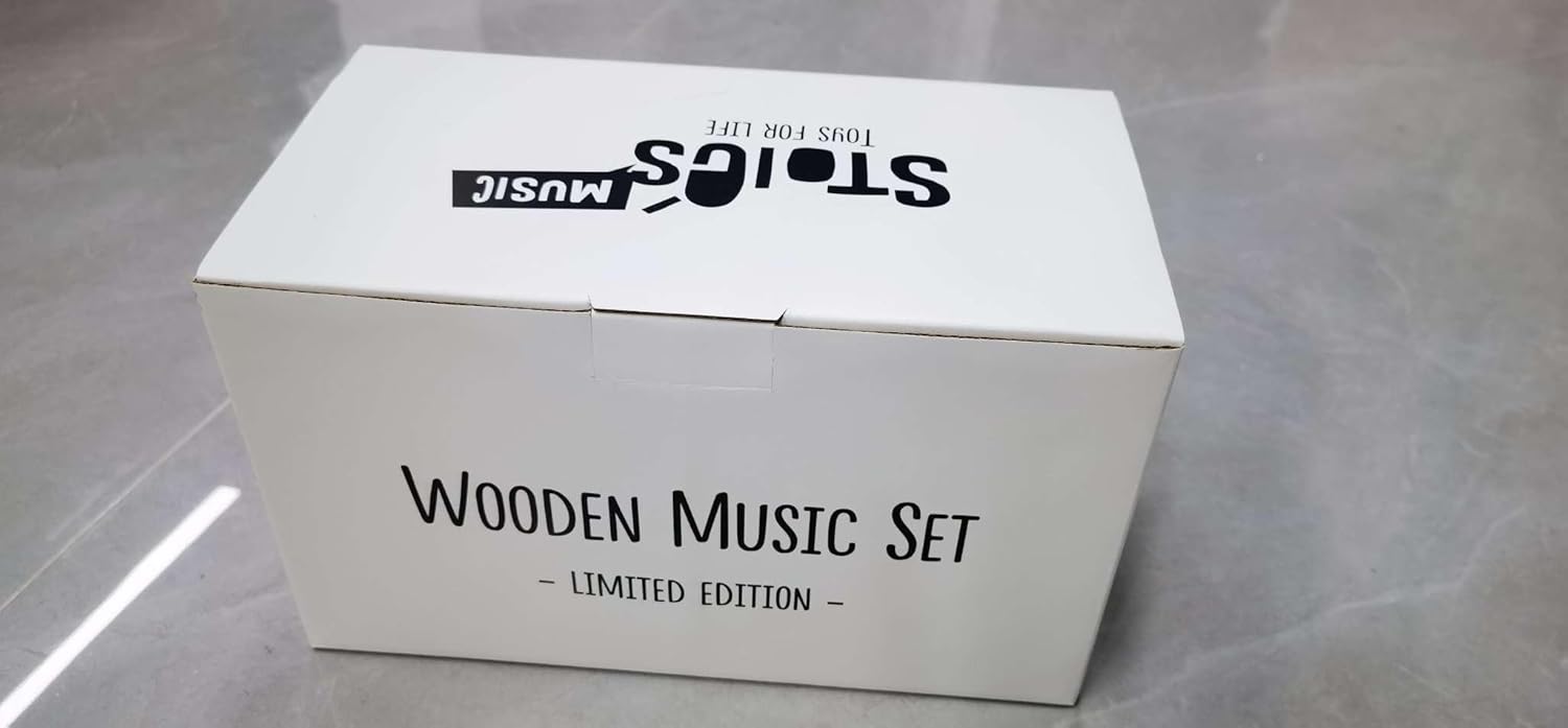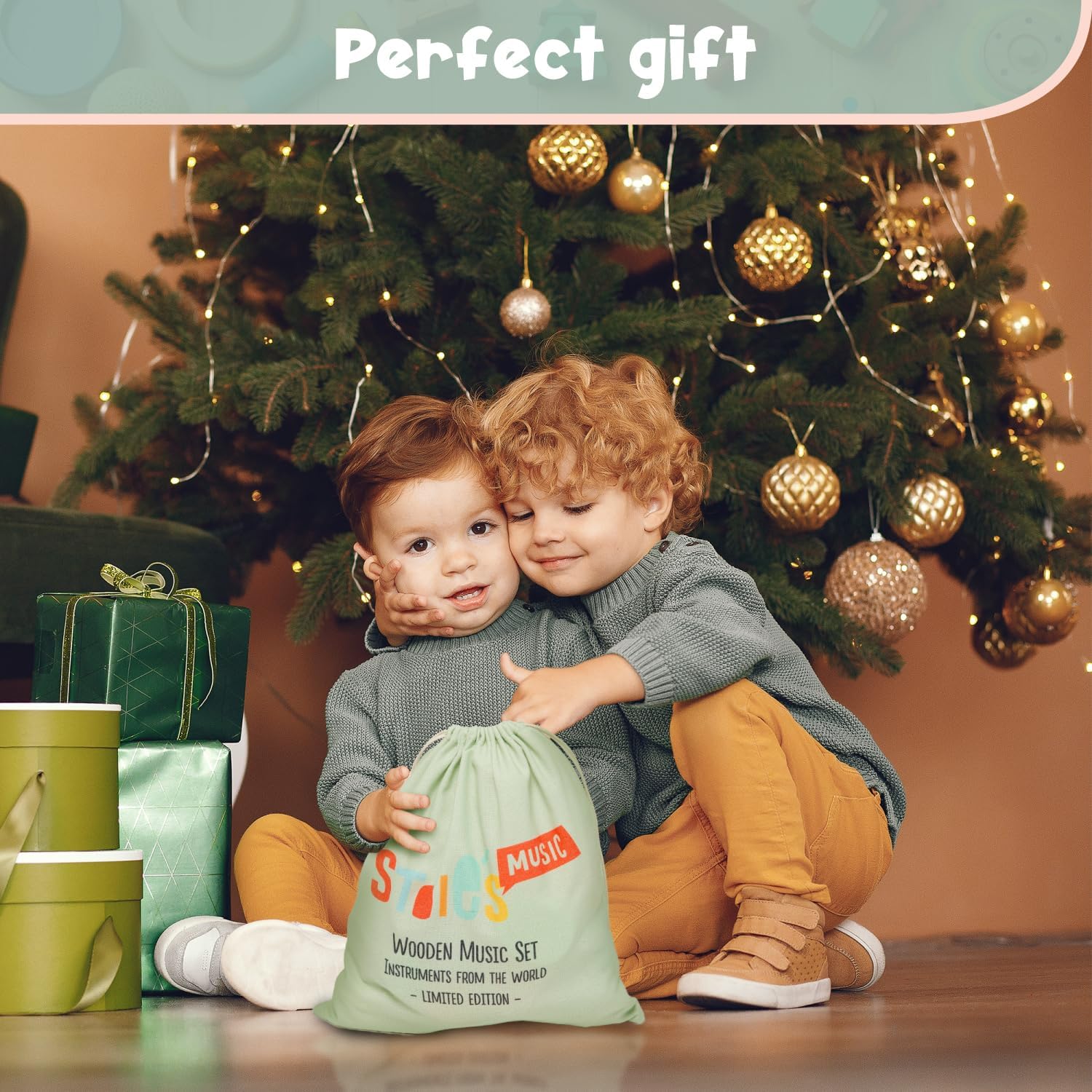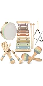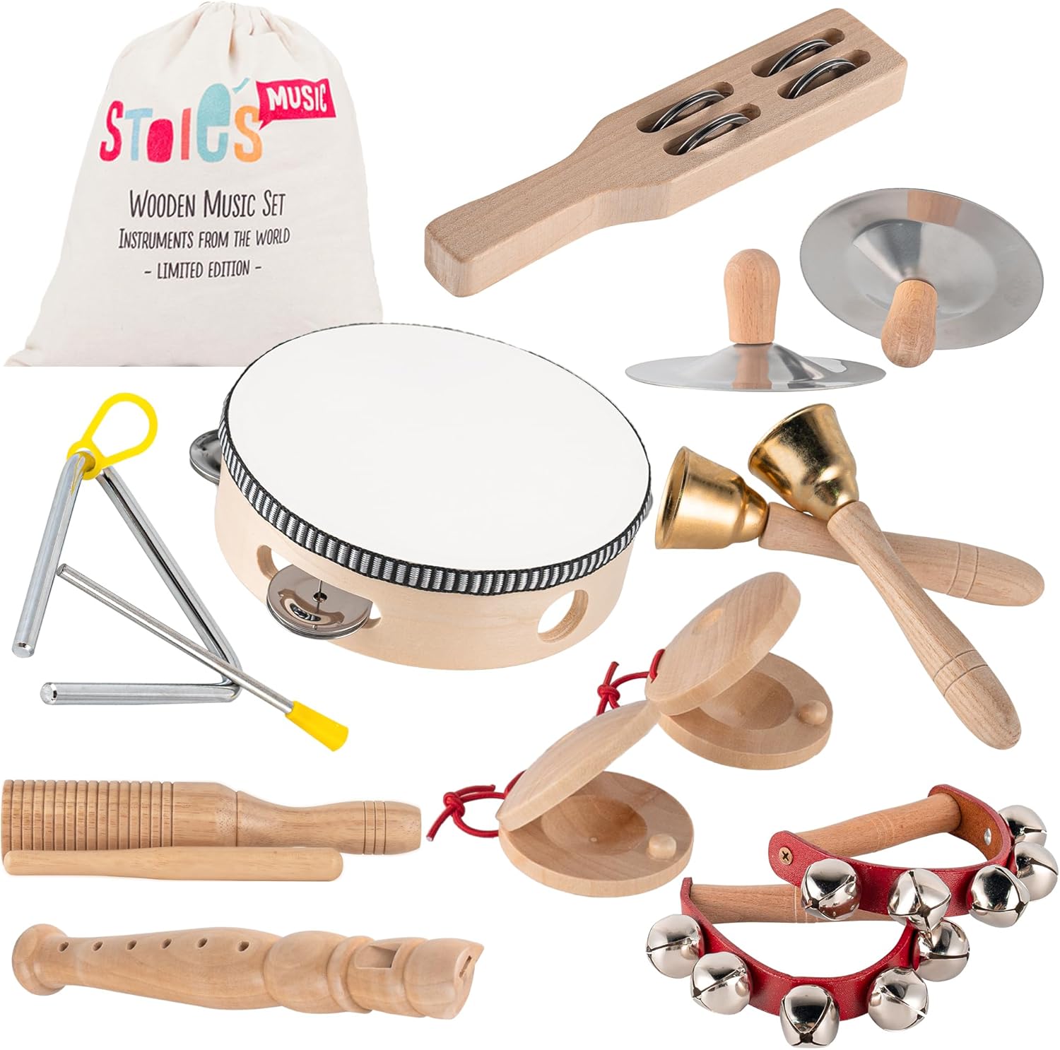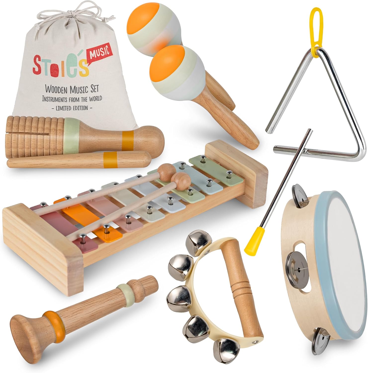 - All-in-One Music Set: Fill your child with the joy of music with stoies wooden toddler musical instruments for kids. Each set includes an 8-tone Xylophone with matching mallets, a Tambourine, two Maracas, a Hand bell, a Clarinet, a Triangle with Striker, Wood sounder and handy cotton storage bag.