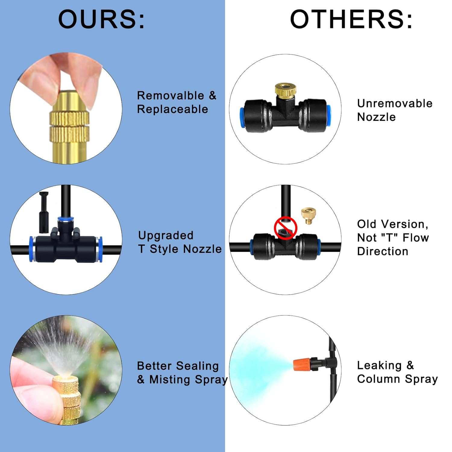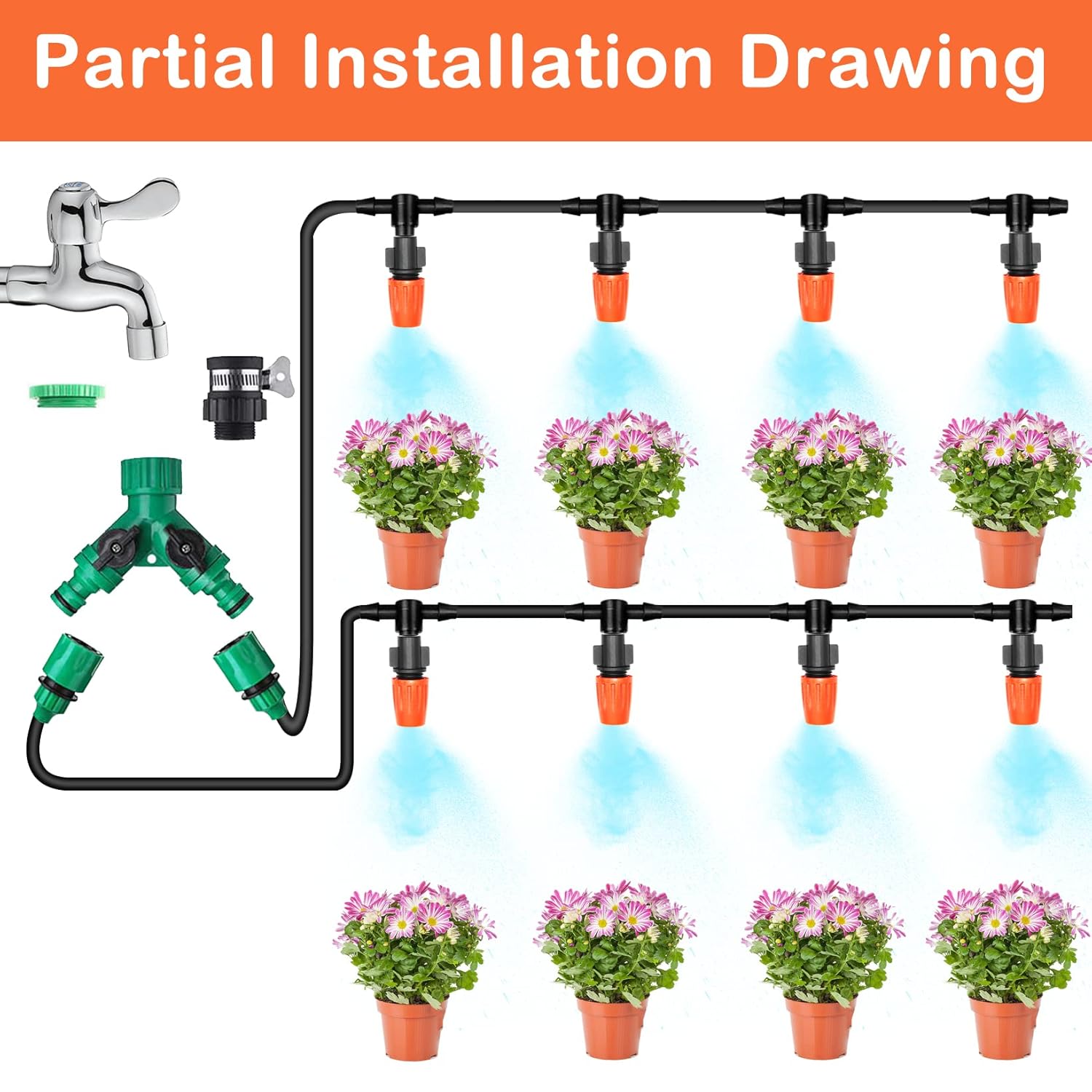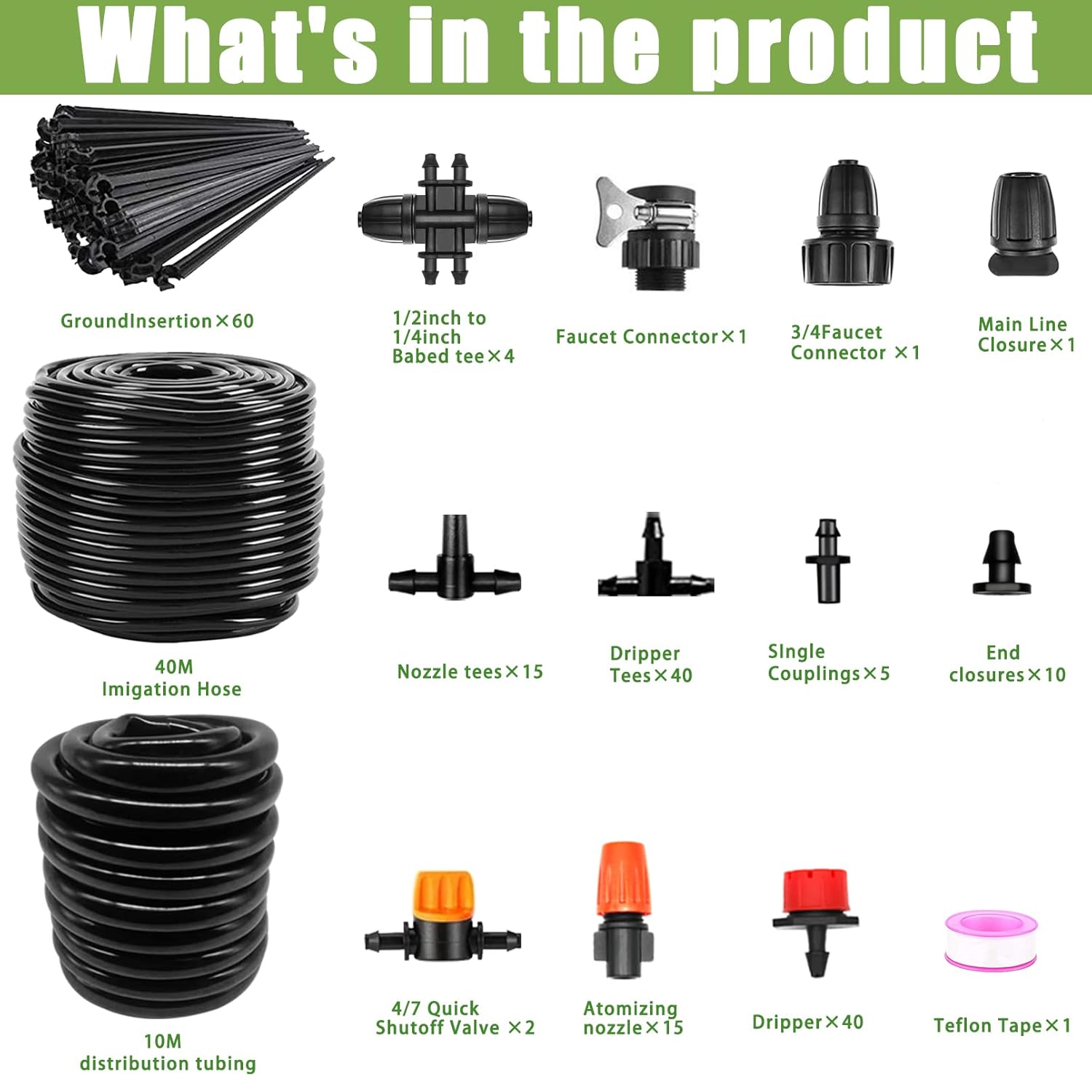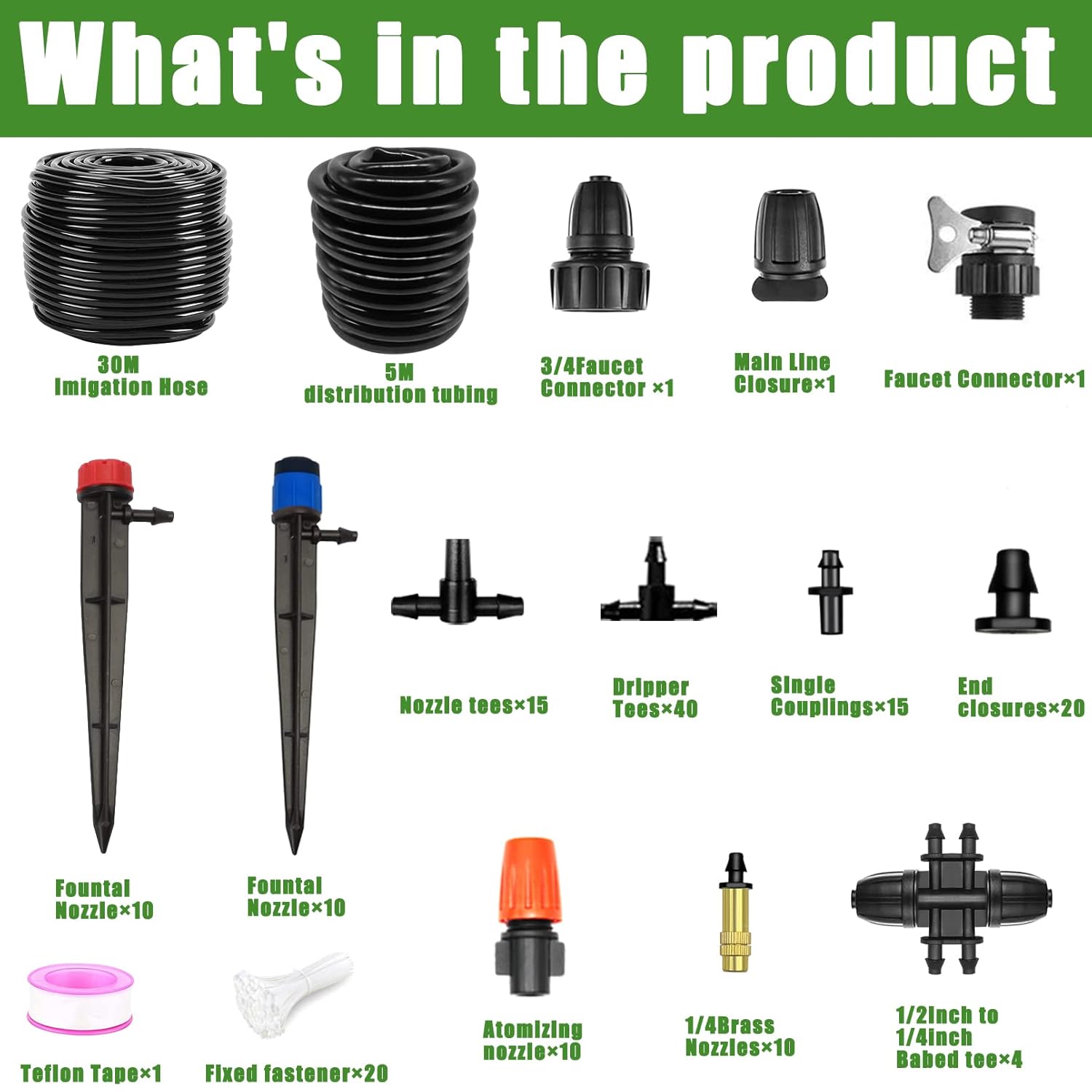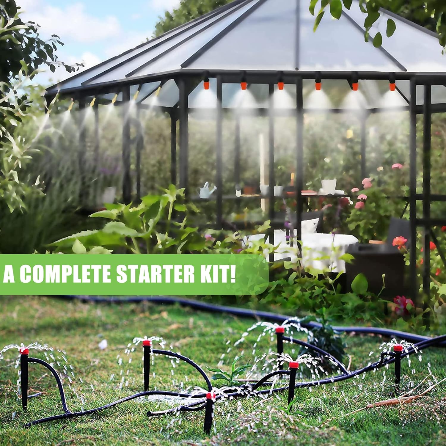- 【UPGRADED MISTING IRRIGATION SYSTEM】Irrigation system kit with 49FT/15M drip irrigation hose and upgraded brass misting nozzles and T-joints has better performance in anti-leaking and connection, the irrigation kit also comes with upgraded faucet adapter with filter net for blocking impurities. Just feel relax after using this upgraded irrigation system, you have no need to spend much time and labor on watering plants everyday.