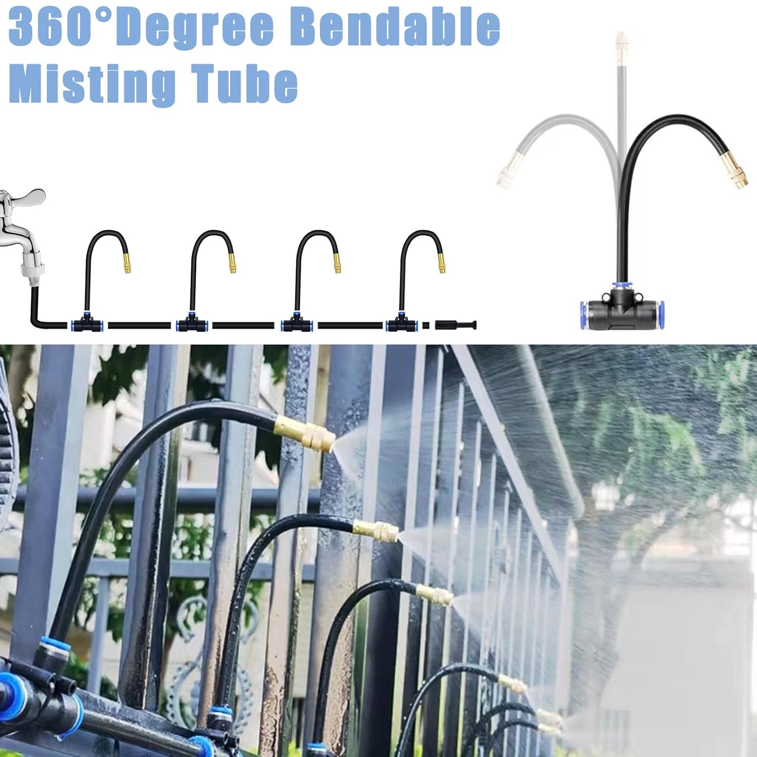 - 【BENDABLE IN 360° & IN ANY DIRECTION】This bendable misting irrigation system allows you to bend its misting nozzles to any direction in 360 degree, which is the much more convenient than most normal irrigation systems in the market. We prepared 10 fix stems help you to fix it on ground or above ground, you may also just hang this misting irrigation kit to fence and no need fixed stems.
