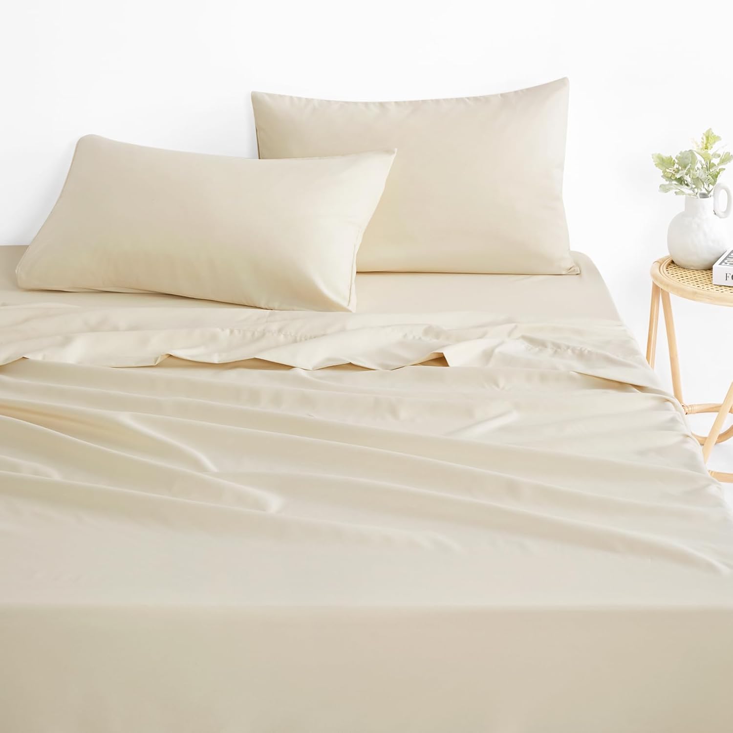 Wake In Cloud - White Sheet Set, 1000TC Ultra Soft Microfiber, Fitted Sheet & Flat Sheet & 2 Pillowcases (4 pcs, Queen Size)